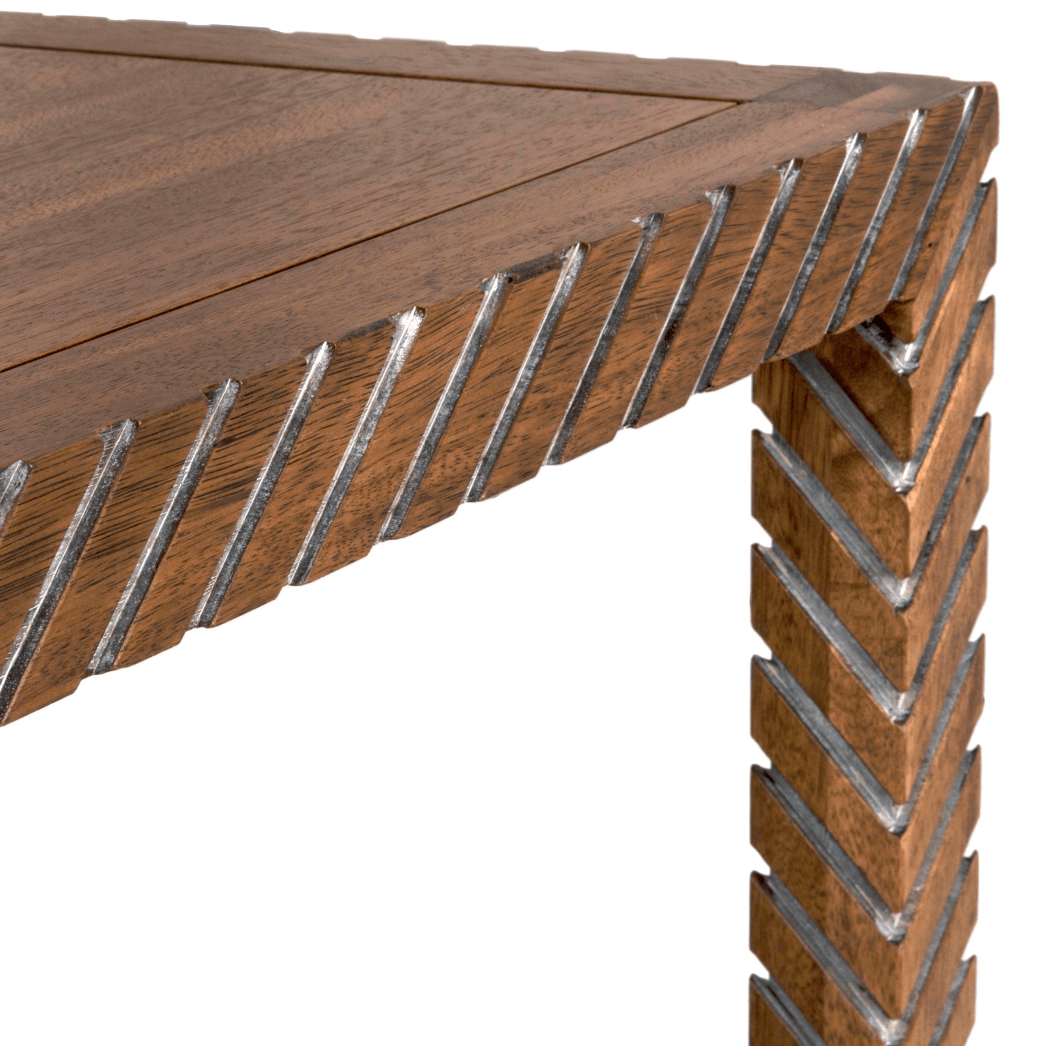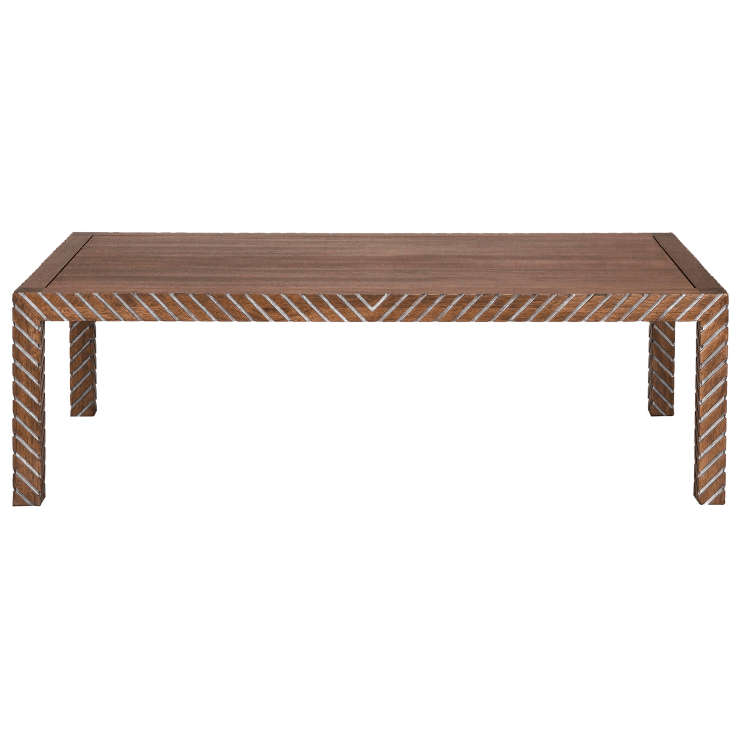 This rectangular dining table showcases a unique blend of modern style and natural charm. Crafted from wood with an intricate herringbone pattern along the edges and legs, it adds a touch of sophistication to any dining space. The table's warm, earthy finish enhances its timeless appeal, making it a versatile centerpiece for gatherings or everyday use. Perfect for those seeking a balance of elegance and practicality in their decor.