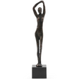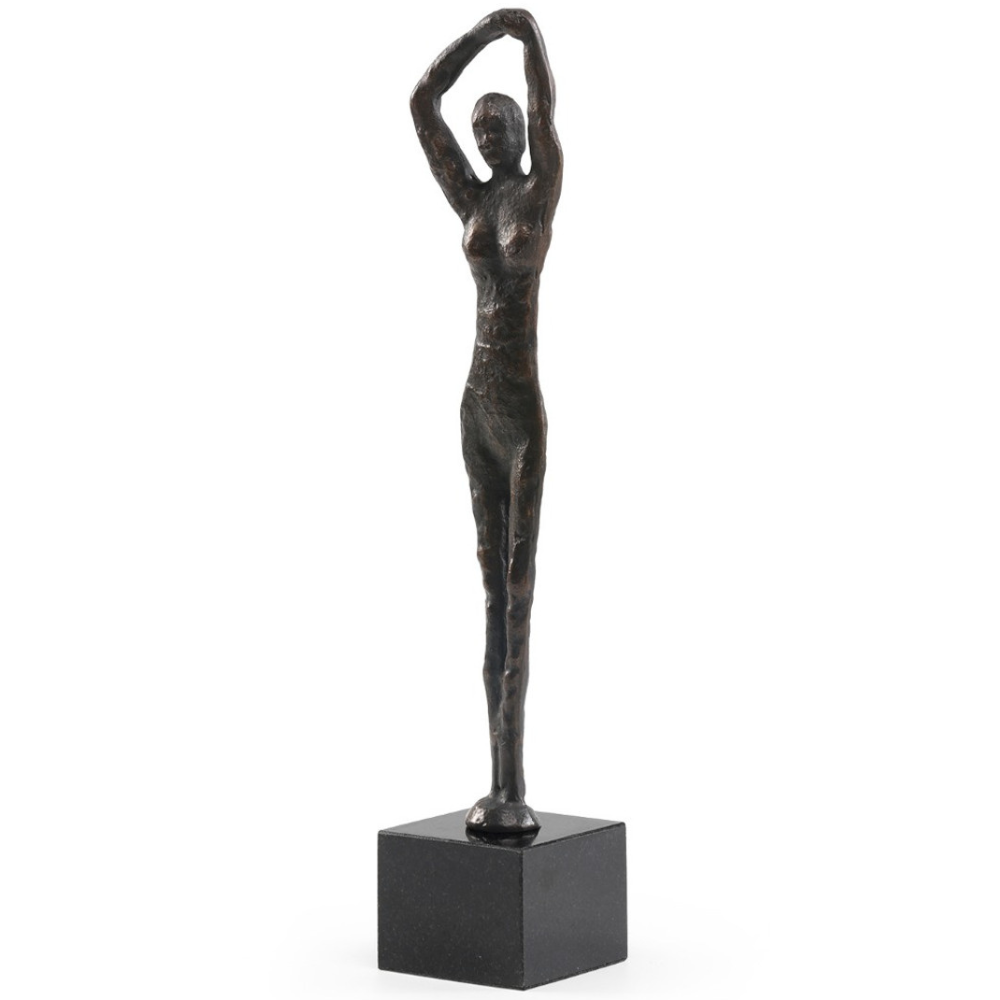 Embodying the essence of its namesake—a 19th century French ballet—the Coppelia Statue captures the grace of a dancer in her most abstract form. Despite being rendered in a solid bronze finish, the piece conveys a sense of fluid movement, as if a pirouette were on its way. On display on a side table, shelf, or étagère, the Coppelia cuts a lithe and languid figure atop a built-in black marble stage.