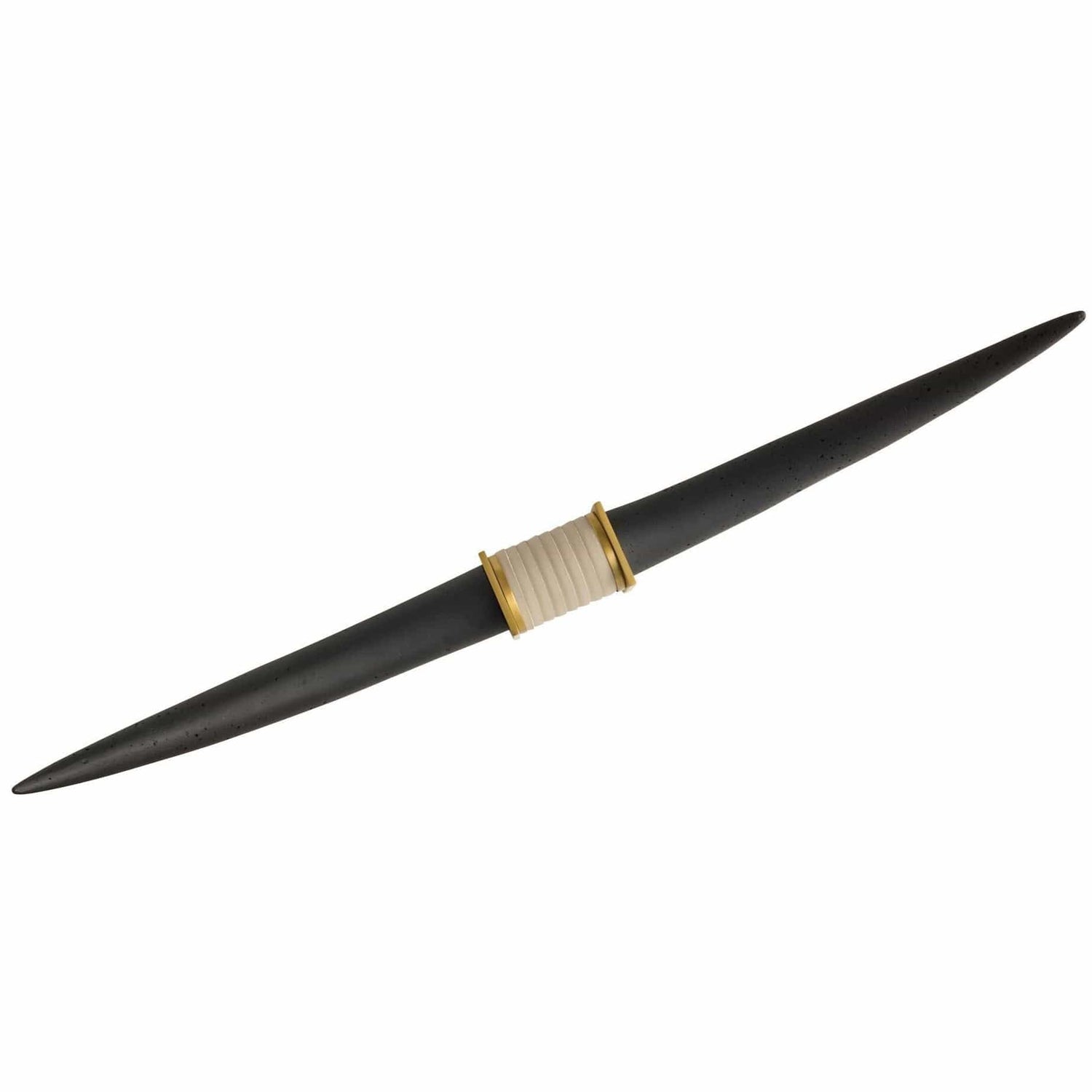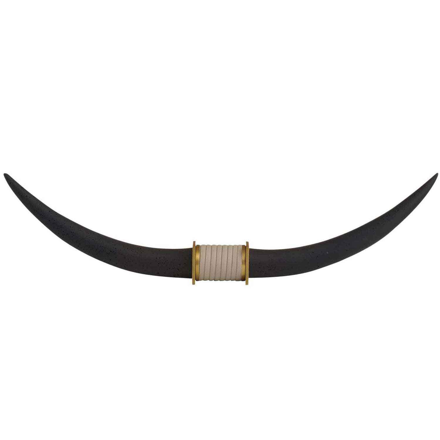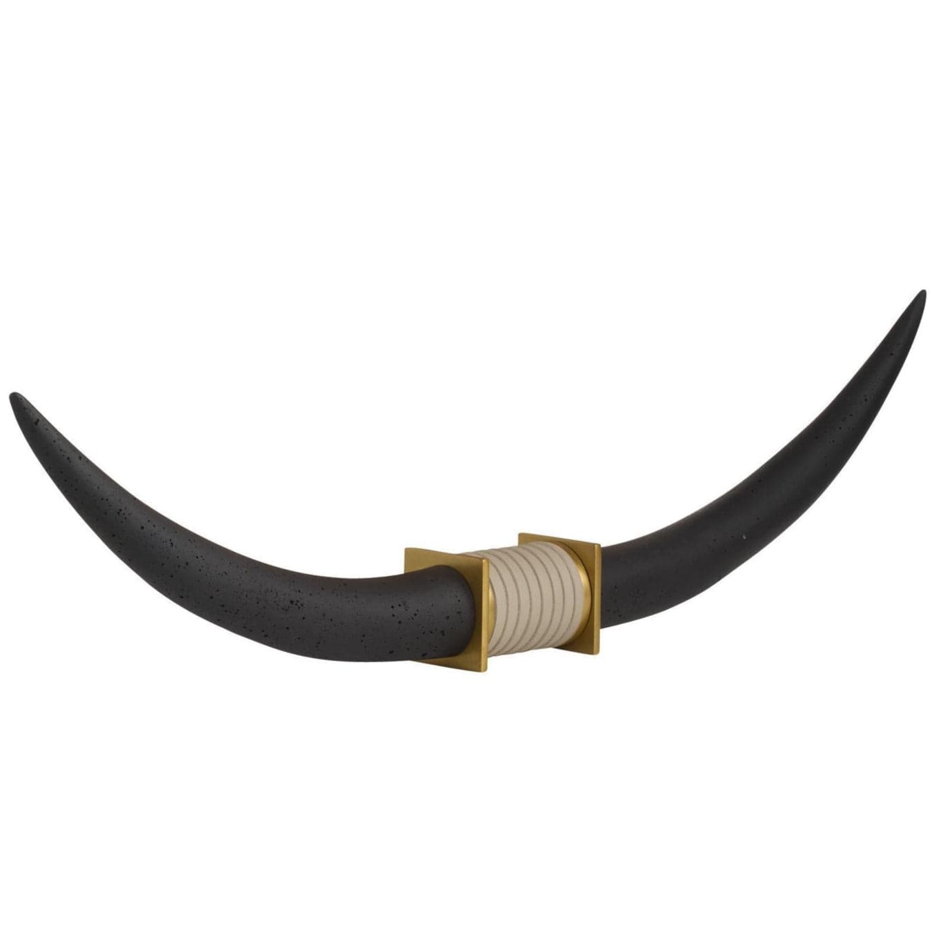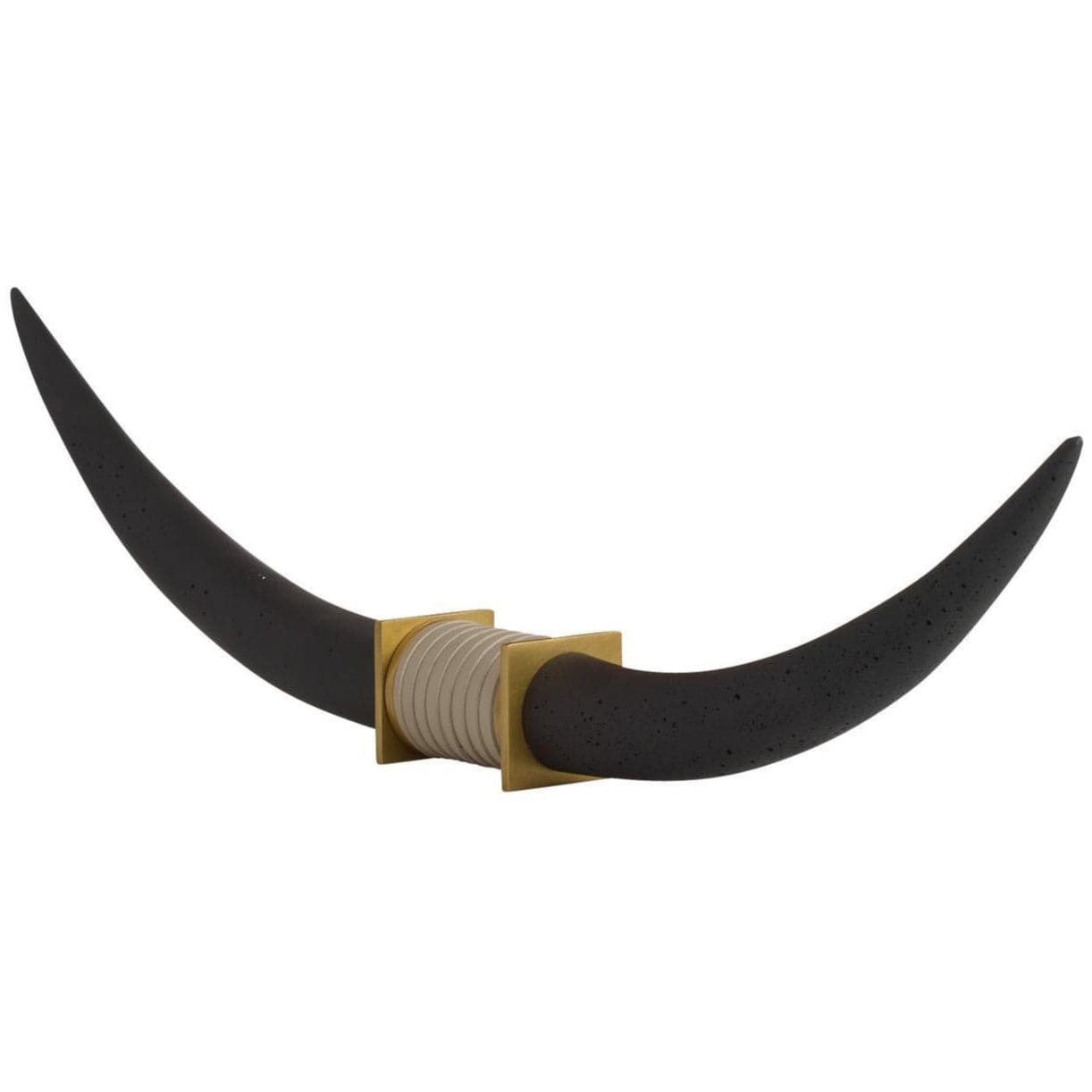 Reminiscent of a Texas longhorn steer, this elegant sculpture's linear shape makes an impact on a console or mantle. Each form of charcoal ricestone composite is securely mounted to a base of antique brass steel, accented with an inset of light gray leather for contrast.