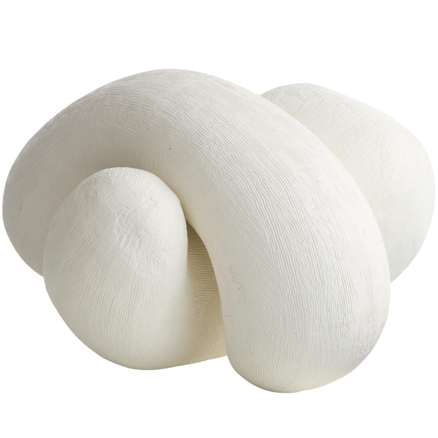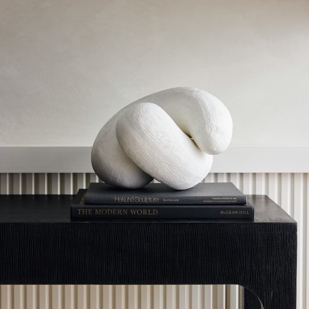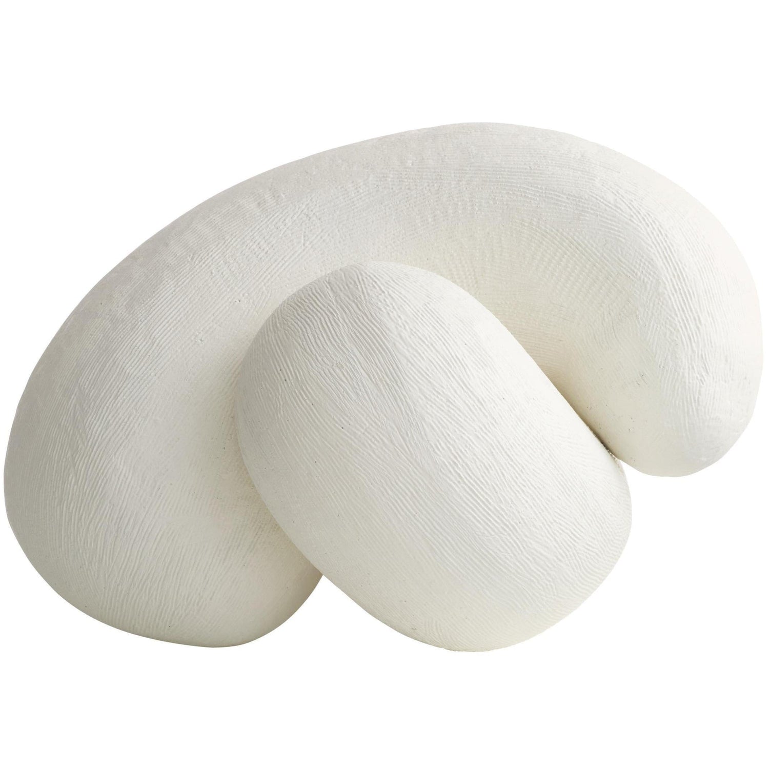 We crafted two amorphous sculptures of white resin that look equally chic when displayed alone or linked together. Fine hairline ridges in the finish accent the amorphous forms.