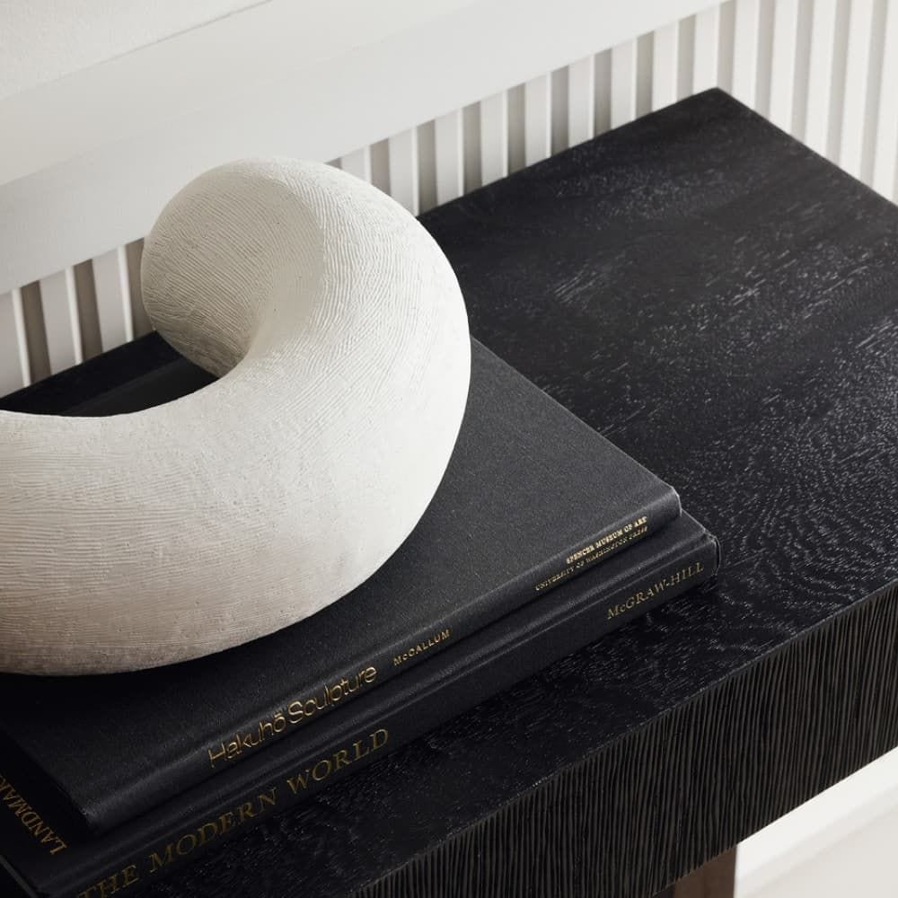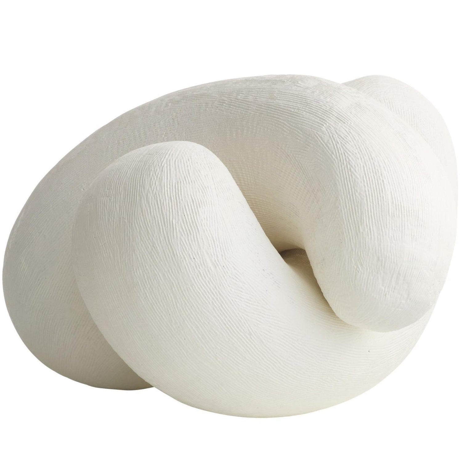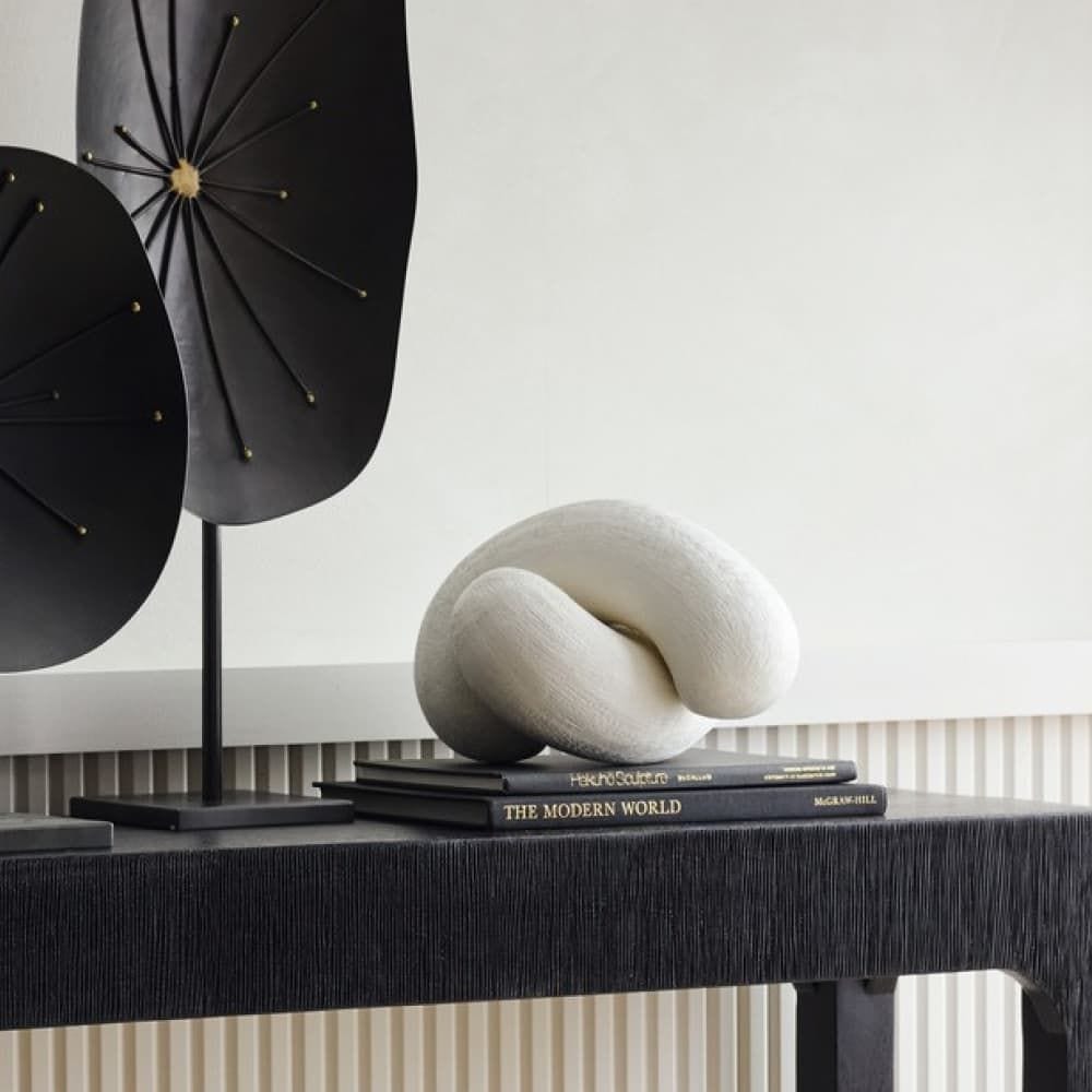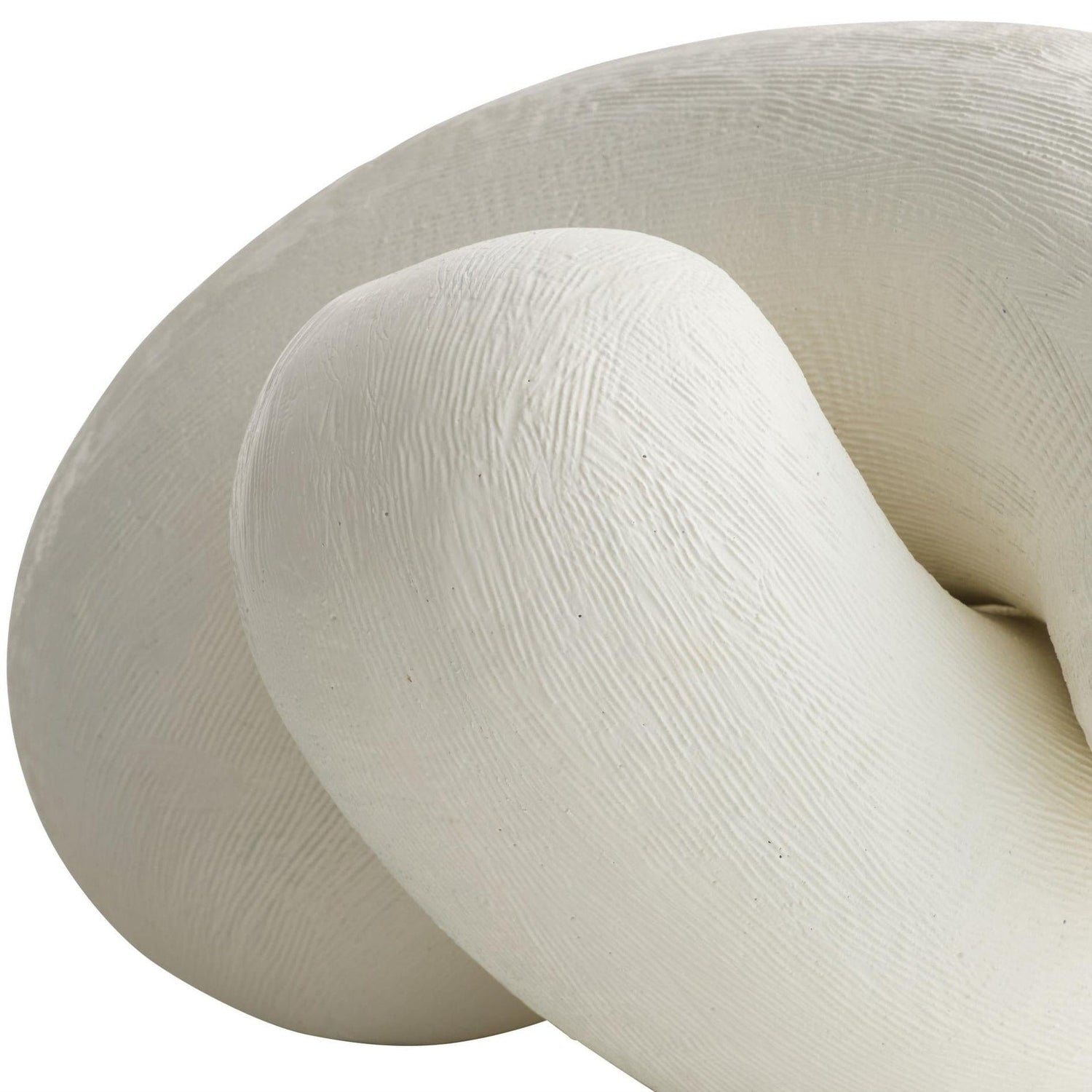 We crafted two amorphous sculptures of white resin that look equally chic when displayed alone or linked together. Fine hairline ridges in the finish accent the amorphous forms.