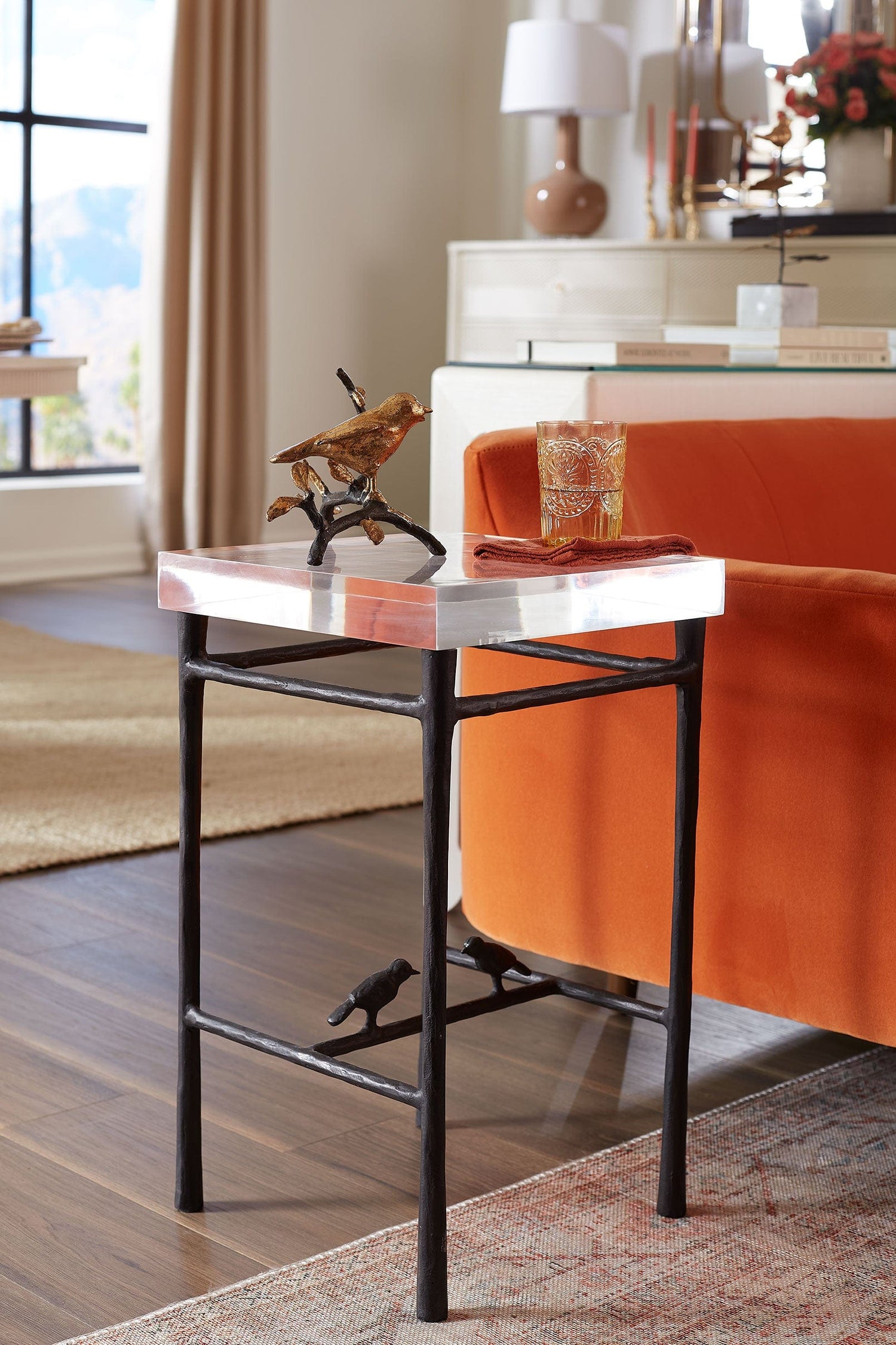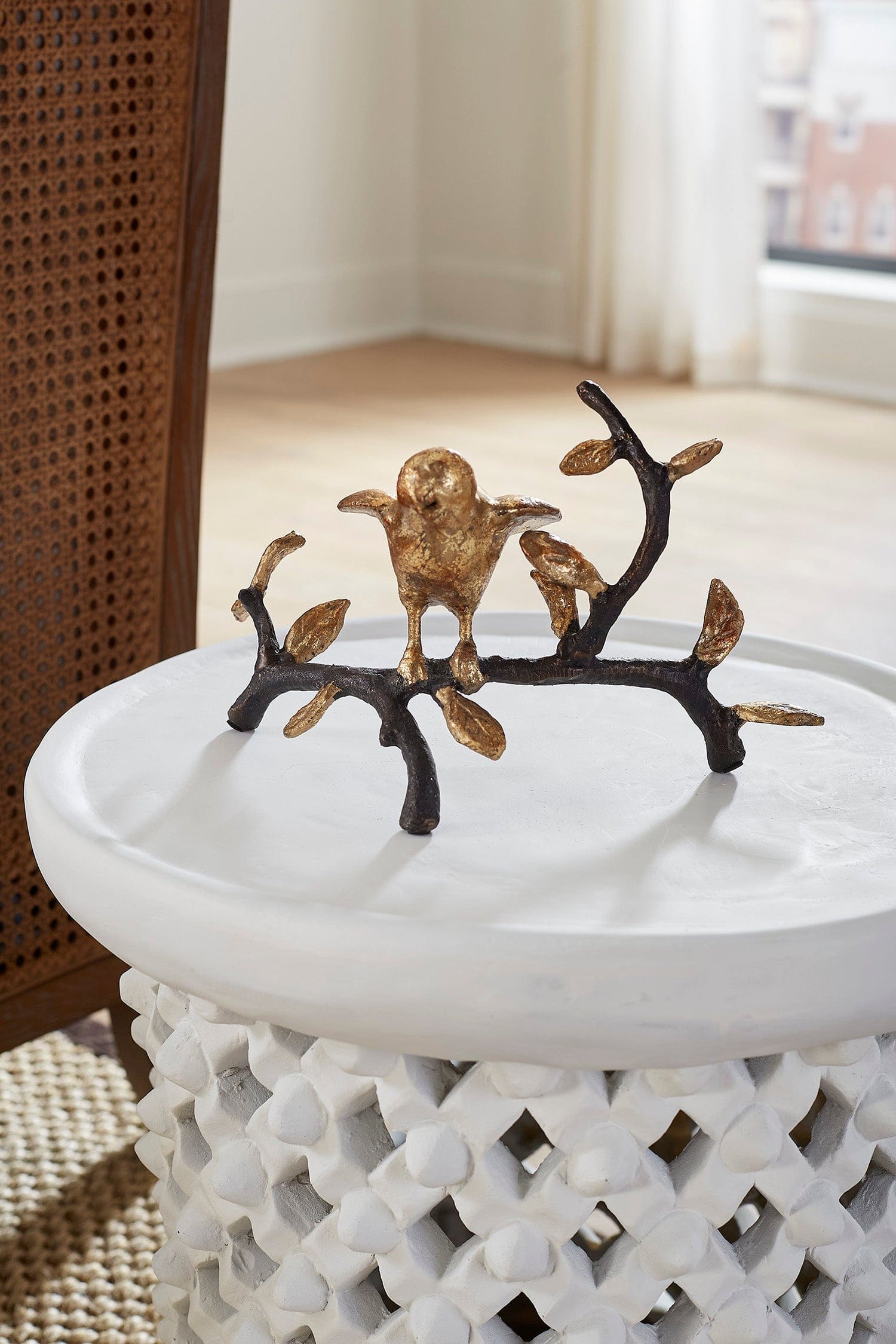 The Uccello Statue, named after the Italian word for "bird," features a graceful sparrow resting on a branch. The bird and leaves are finished in gold leaf, while the branch is crafted from bronze, creating a striking contrast. As a free-standing statue, it makes a charming and natural decor element, adding warmth to any space.