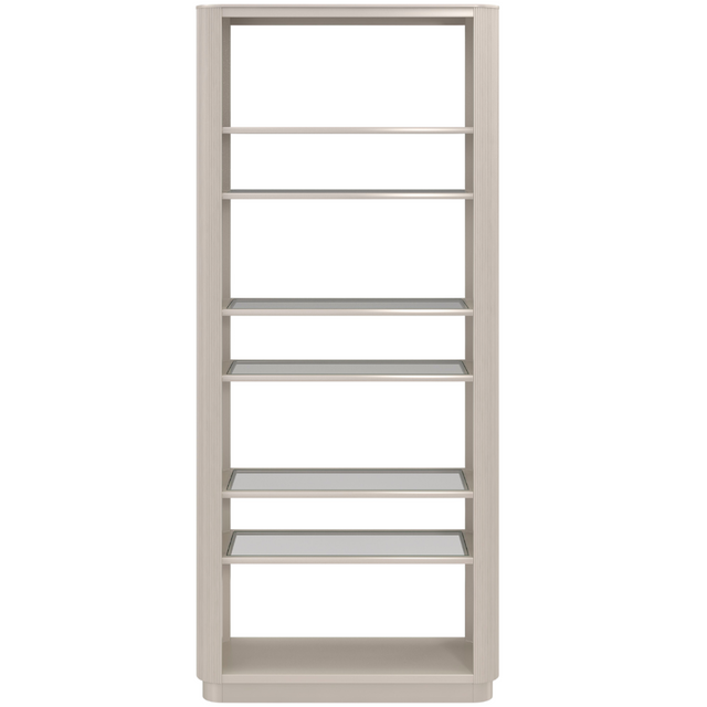 Elevate display for curated books and collectibles with this tall bookcase, crafted in Birch and Maple veneers in a Matte Pearl finish. Narrow reeding and softly rounded edges create a tactile frame for wood-rimmed glass shelves that allow for light and reflection. Style one or more against a wall to make an impact, or float away from the wall to divide an open space.