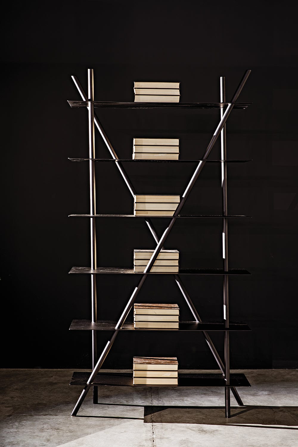 The Siddhartha Bookcase features six spear-like legs positioned diagonally through six shelves. Black finished industrial steel.