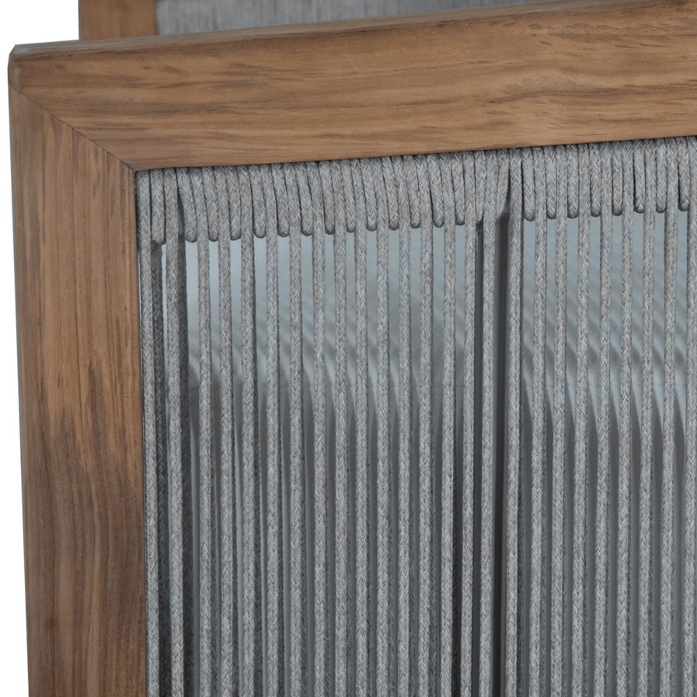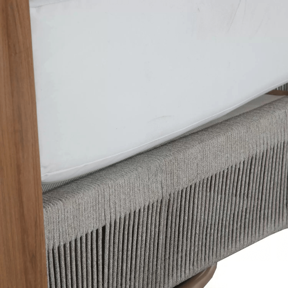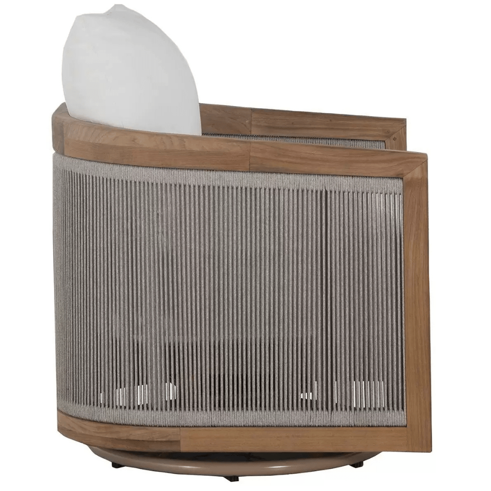 Introducing the Avalon Swivel Lounge, a luxurious blend of teak and olefin rope that combines style, durability, and motion. This distinctive lounge features a barrel back design that nearly extends to the ground, with an Indonesian natural teak frame providing both comfort and elegance. The woven olefin rope, known for its resistance to moisture, UV rays, and mildew, ensures lasting durability, making it perfect for outdoor use. What sets the Avalon Swivel Lounge apart is its ability to swivel smoothly from side to side, offering a dynamic seating experience. The low back design adds visual intrigue as the teak frame nearly converges at the back, while the plush cushions, with the back cushion sitting higher than the lounge's back, provide enhanced comfort and support. Elevate your outdoor relaxation with the Avalon Swivel Lounge, where timeless design meets unparalleled comfort and mobility. Please call (800) 440-5121 for custom fabric options.