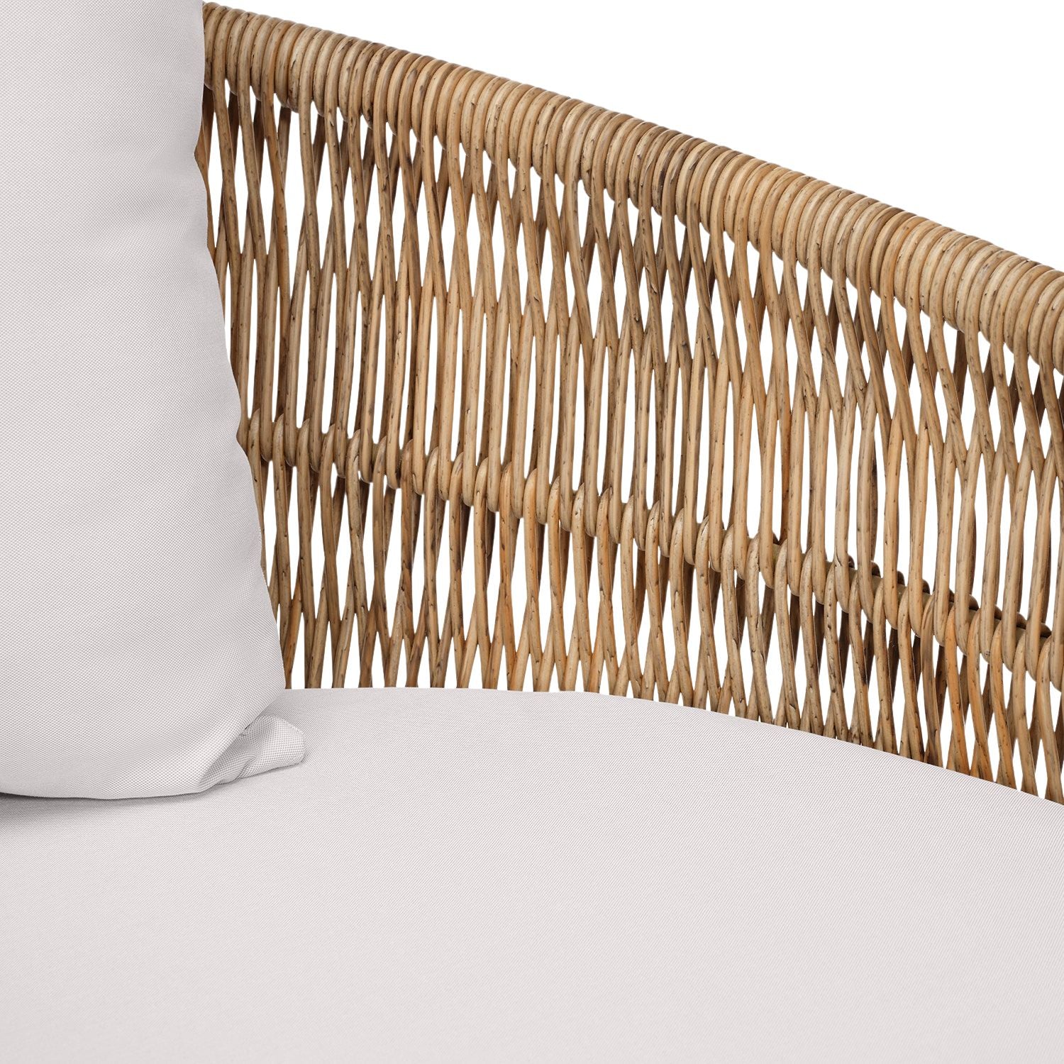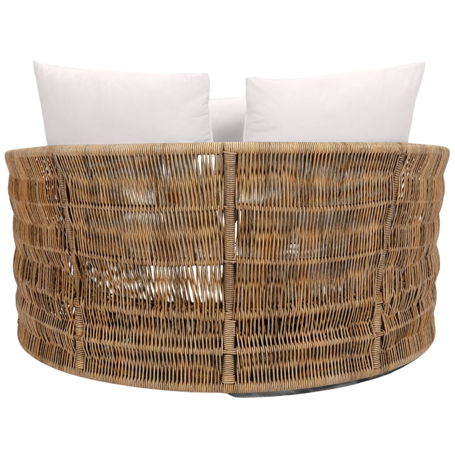 No staycation is complete without the Fowler swivel daybed, crafted with faux banana leaf into a wide circular frame to accommodate those afternoon siestas in the sun. Cushion and pillows come upholstered in our Alsek White or can be upholstered with one of our luxe upholstery fabrics or COM.