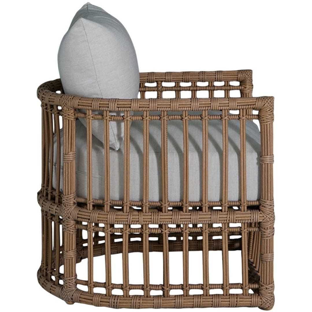 The Newport Woven Barrel Chair, with its rounded silhouette, weaves a touch of coastal charm into your outdoor space. Crafted with durable N-Dura™ resin wicker, it's built to withstand the elements, ensuring both longevity and easy maintenance. The design harks back to vintage rattan furniture, offering both a classic look and modern resilience. Perfect for a cozy reading nook on your patio or as a stylish accent in a sunroom, the Newport Barrel Chair invites relaxation with its deep, comfortable cushioning and additional lumbar pillow for support. Please call (800) 440-5121 for custom fabric options.