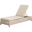 This woven Tapestry Outdoor Chaise Lounge by Essentials For Living will add a touch of coastal style to your backyard or patio. It measures 28" wide, 80" deep, 44" high, with a seat height of 16". It is constructed with an aluminum frame and solid washed ever teak legs, making it suitable for outdoor use and durability. An oat flat rope is tightly woven to create an intricate mesh-like design that frames the seat and back rest. The teak legs and exposed base have a beautiful finish that is resilient to weather elements. Containing a removable all-weather cushion made of performance ecru olefin fabric, the cushion is easy to clean and store. The backrest is adjustable for laying or sitting at any degree of comfort. The cushion and lounge should be stored away in extreme conditions.
