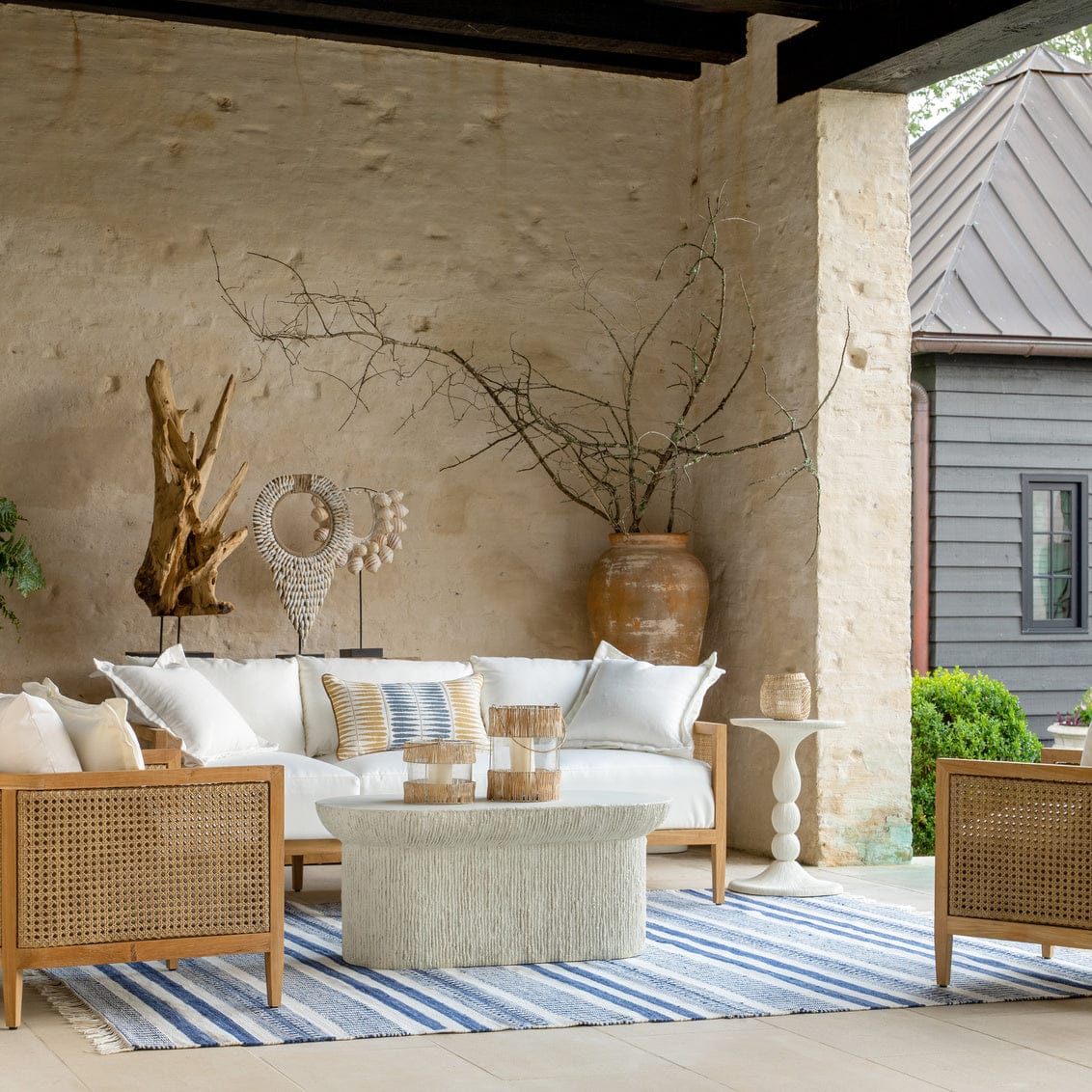 The Brant Oval Coffee Table is a masterpiece of versatility, merging the durability of cast stone with the aesthetic finesse to grace both indoor and outdoor spaces. Its distinctive textured details and minimalist oval form make it a statement piece. Available in the soothing tones of Natural White and Aged Stone Grey, it complements a variety of settings, allowing you to blend it seamlessly with diverse decor styles. The Brant Oval Coffee Table invites timeless elegance into any living space.