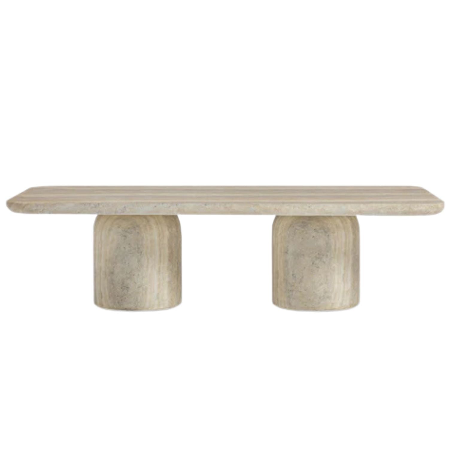 The Rosalie Coffee Table pairs a bold brutalist silhouette with a warm faux travertine finish that feels timeless and architectural. Crafted from durable concrete, it's built to withstand weather, spills, and everyday living while offering the refined look of natural stone. A sculptural centerpiece that transitions seamlessly from patio to living room.