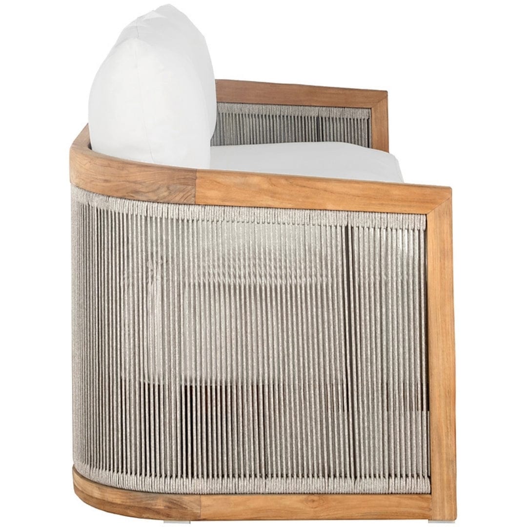 Introducing the Avalon Sofa, a sophisticated blend of teak and olefin rope that embodies style and durability. This sofa features a distinctive barrel back design that extends to the ground, showcasing an Indonesian natural teak frame, which makes for comfortable arm rests. The woven olefin rope is exceptionally durable, resisting moisture, UV rays, and mildew, making it ideal for outdoor use. The low back design of the sofa adds visual intrigue as the teak frame nearly converges at the back. Plush cushions provide exceptional comfort, with the back cushions sitting higher than the sofa's back for enhanced support. The frame’s seamless semi-barrel shape extends to the ground, ensuring stability and elegance. Elevate your outdoor living space with the Avalon Sofa, where timeless design meets unparalleled comfort and resilience. Please call (800) 440-5121 for custom fabric options.