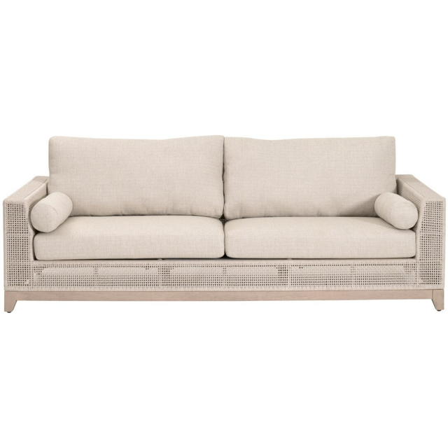 Composed of squared lines, an exposed wood base, and rope frame, the alluring Tropez Outdoor 90" Sofa by Essentials For Living will be an ideal addition to your outdoor living space. This sofa is suitable for many designs with its coastal style and transitional design. It is upholstered with a performance pumice olefin fabric that is weather resistant. The seat and back cushions are both reversible for easy cleaning, and removable for storing away in heavy weather. The full sofa should be stored away in extreme conditions. This also includes two round bolster pillows that complete the look. The frame is covered with a hand-woven, flat rope design. The wood base is constructed with beautiful teak that ages gracefully. The neutral color scheme and simple look of this sofa exude an inviting aesthetic, which is perfect for a casual backyard atmosphere.