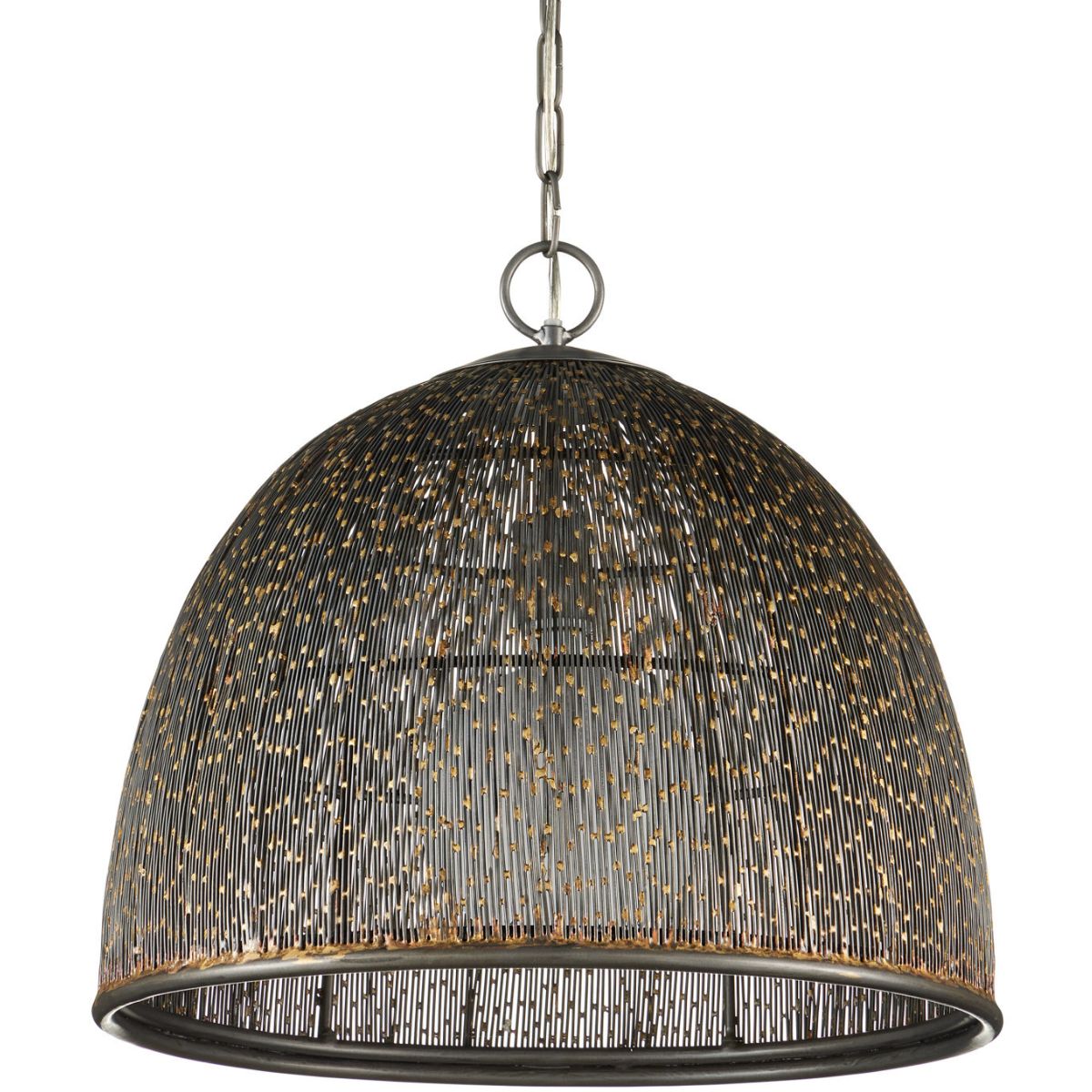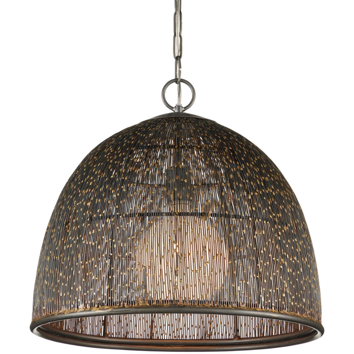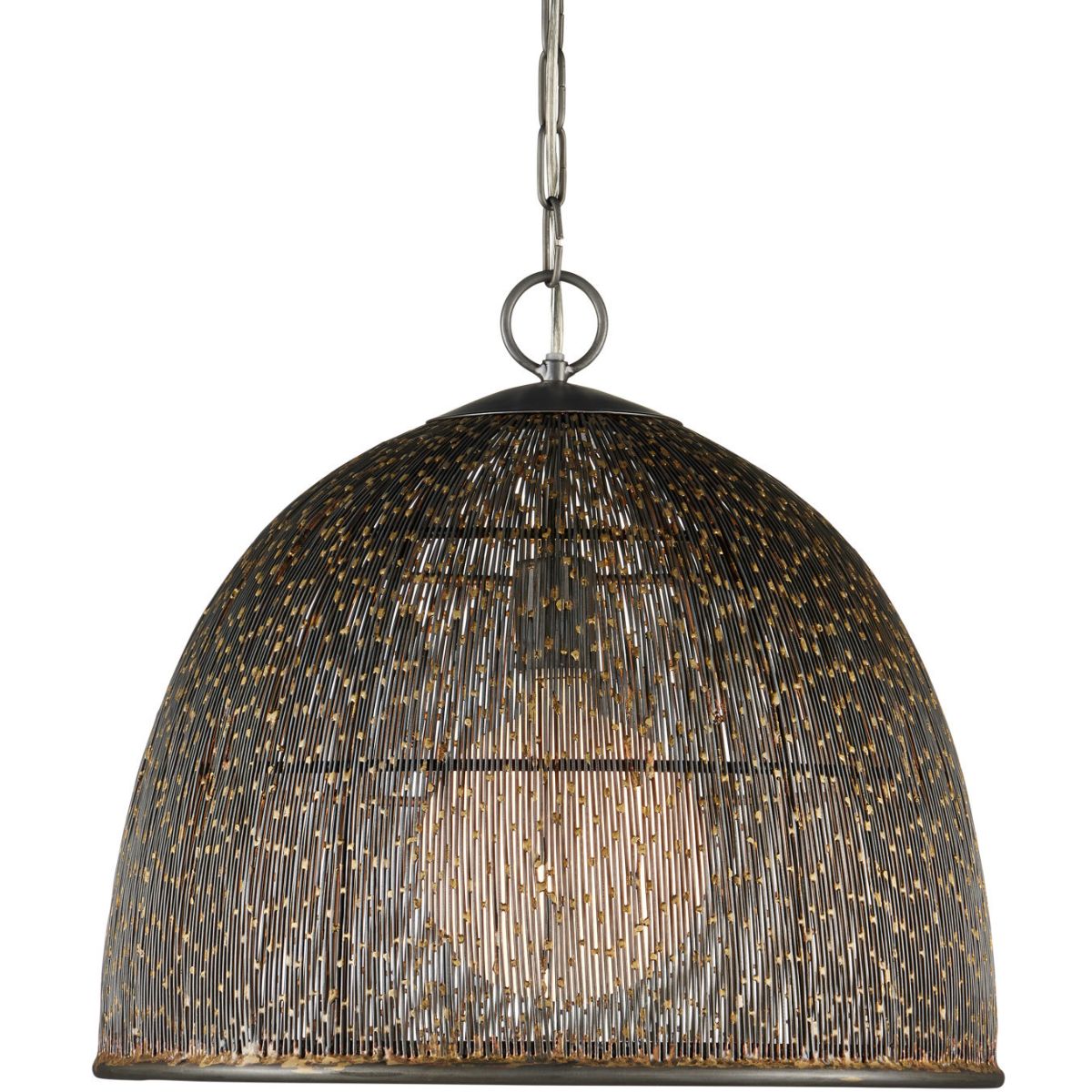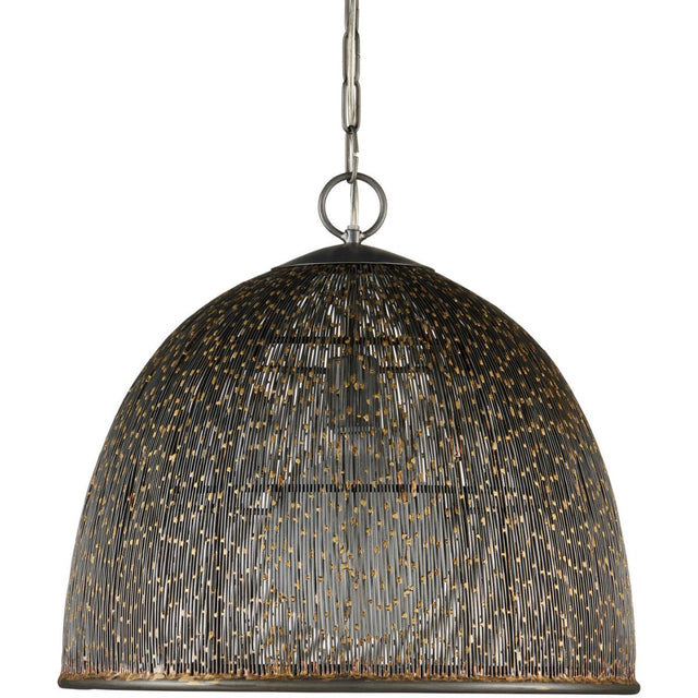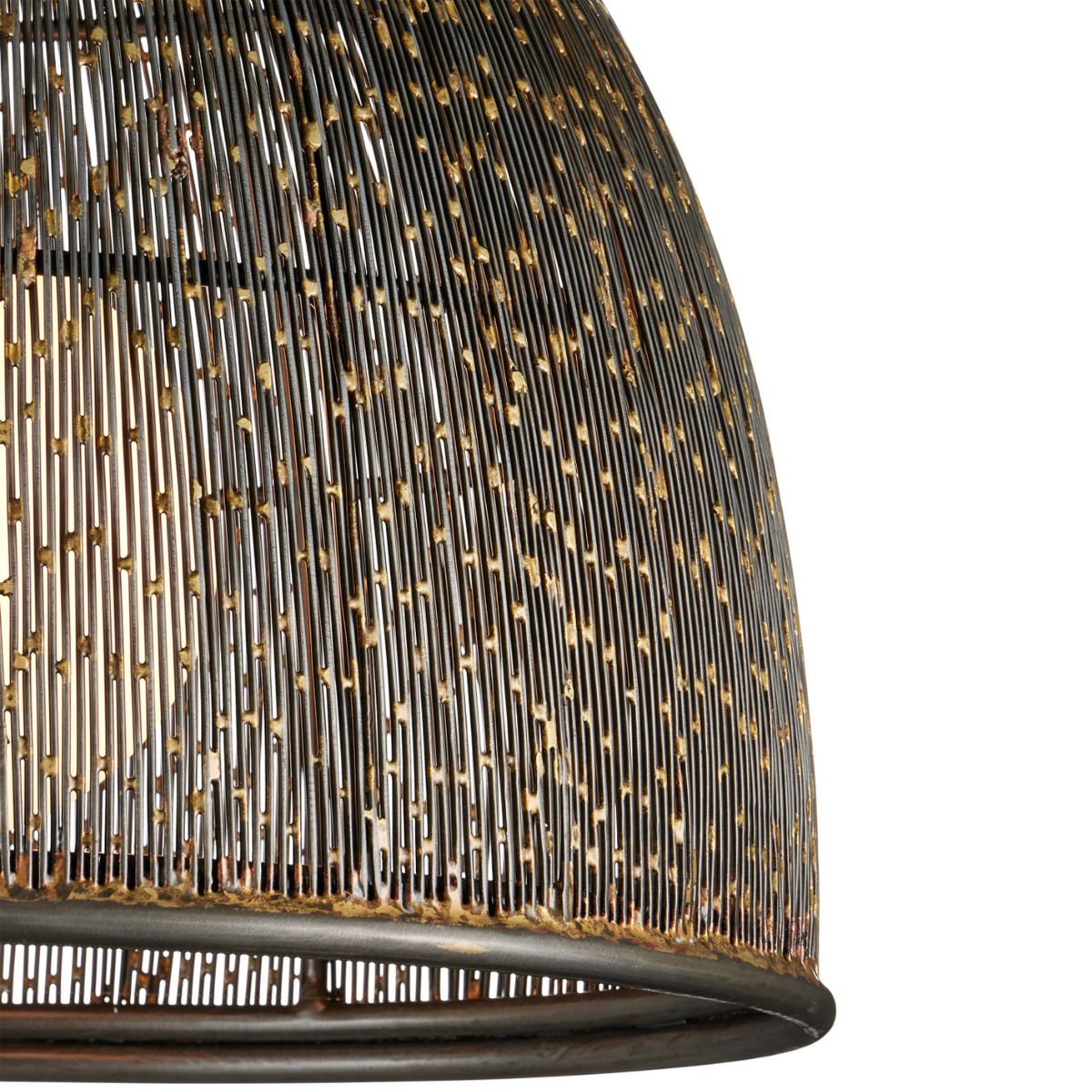 A sophisticated textural patina transforms the dome-shaped Eduardo Pendant to take it from typical to exceptional. Made of strands of thin iron wires that are welded onto the fixture's form and brazed to create the pebbly pattern, the dark brown pendant glints like it is sprinkled with gold flecks when light strikes its open-weave surface. The one-light fixture is dimmable and the surface details may differ from pendant to pendant given the treatment to achieve it is artisanal in nature.