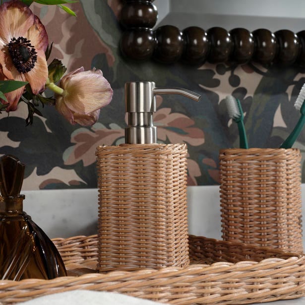 The organic woven rattan of the Kardia introduces a chic and polished style to the bath.
