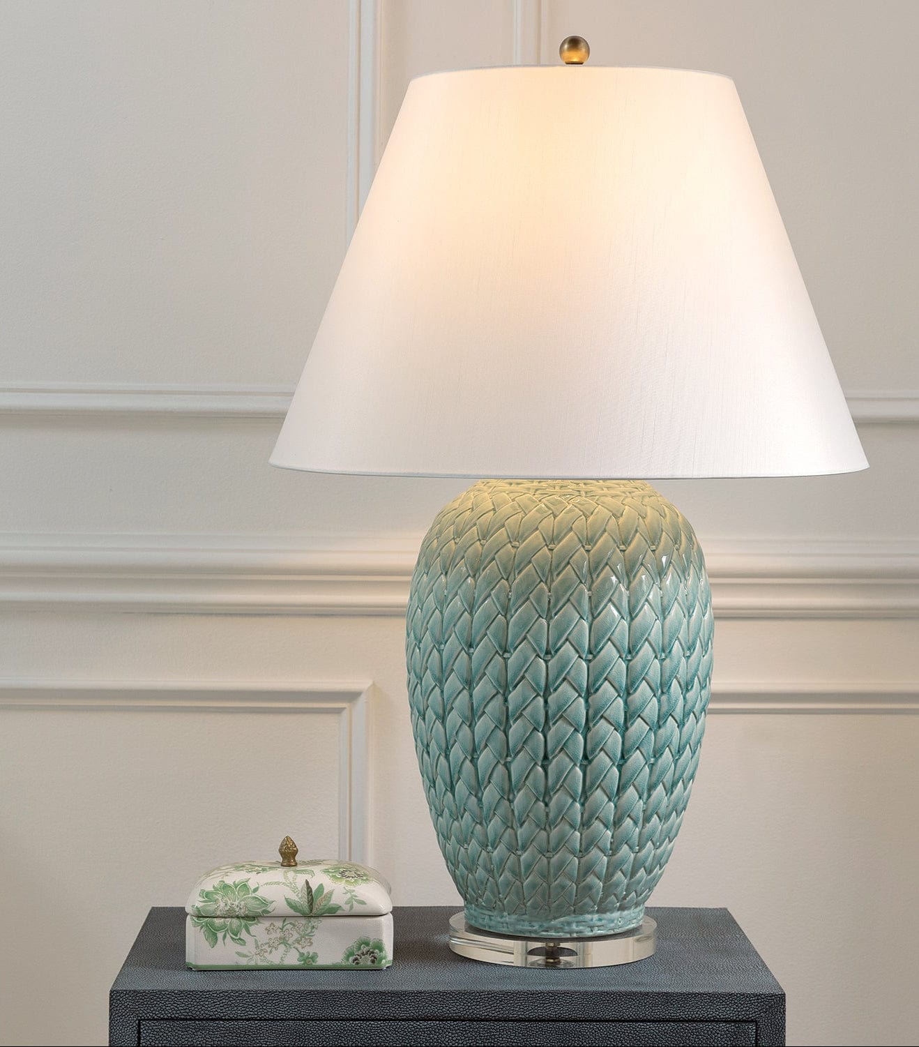 Naples is our grand scaled lamp which features carved wicker inspired pattern cast into the mold. Offered in celadon and cream translucent glazes, the lamp is casual, yet sophisticated for your island or traditional home. Accented with aged brass hardware. Metal ball finial. Lucite base.