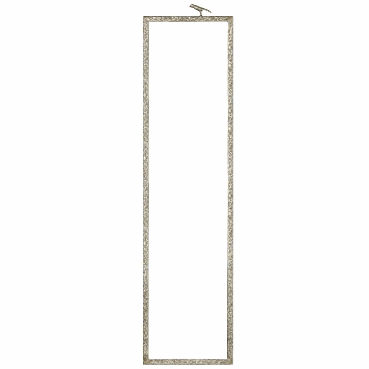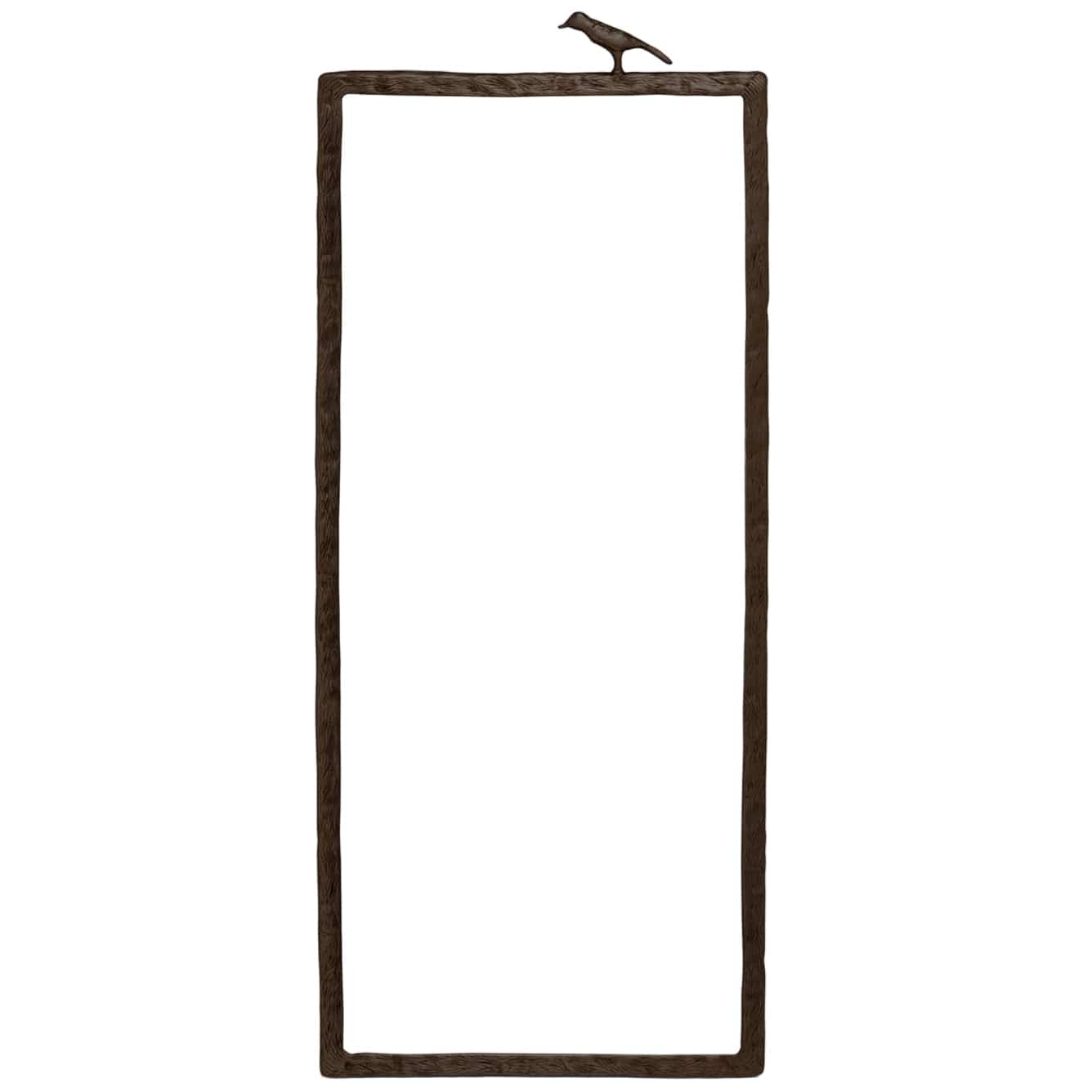 This mirror is bordered in textured metal reminiscent of wood grain. Small sparrows perch on top.