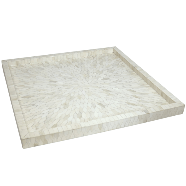 Handcrafted in India, the Montara Square Bone Tray in creamy white or grey catches the eye with a veneer of mosaic bone art in a delicate floral pattern. You’ll find so many reasons to use this unique decorative tray – and never put it away. Perfect for wine and cheese pairings at your next event, to display a collection of meaningful trinkets or a cluster of candles to set the mood.