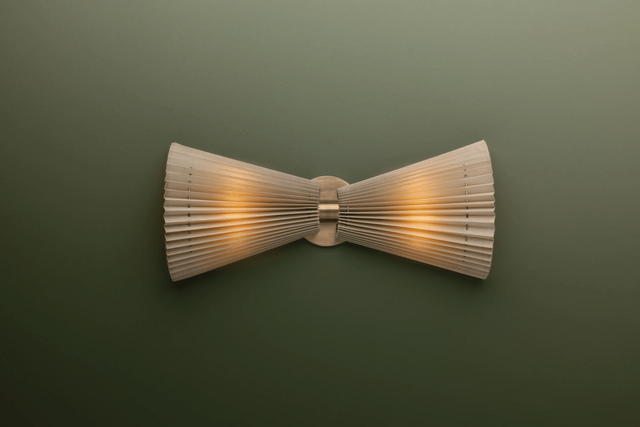 Simultaneously soft and architectural, the Dell sconce pulls from vintage references of artful pleats and fan-like shapes. Available in a single or double light, the faux silk shades are gathered by thin metal rods that run through the shades, creating a natural, slightly irregular draping. The Patina-Brass finish of the hardware adds to the antique feel of this elegant wall light.