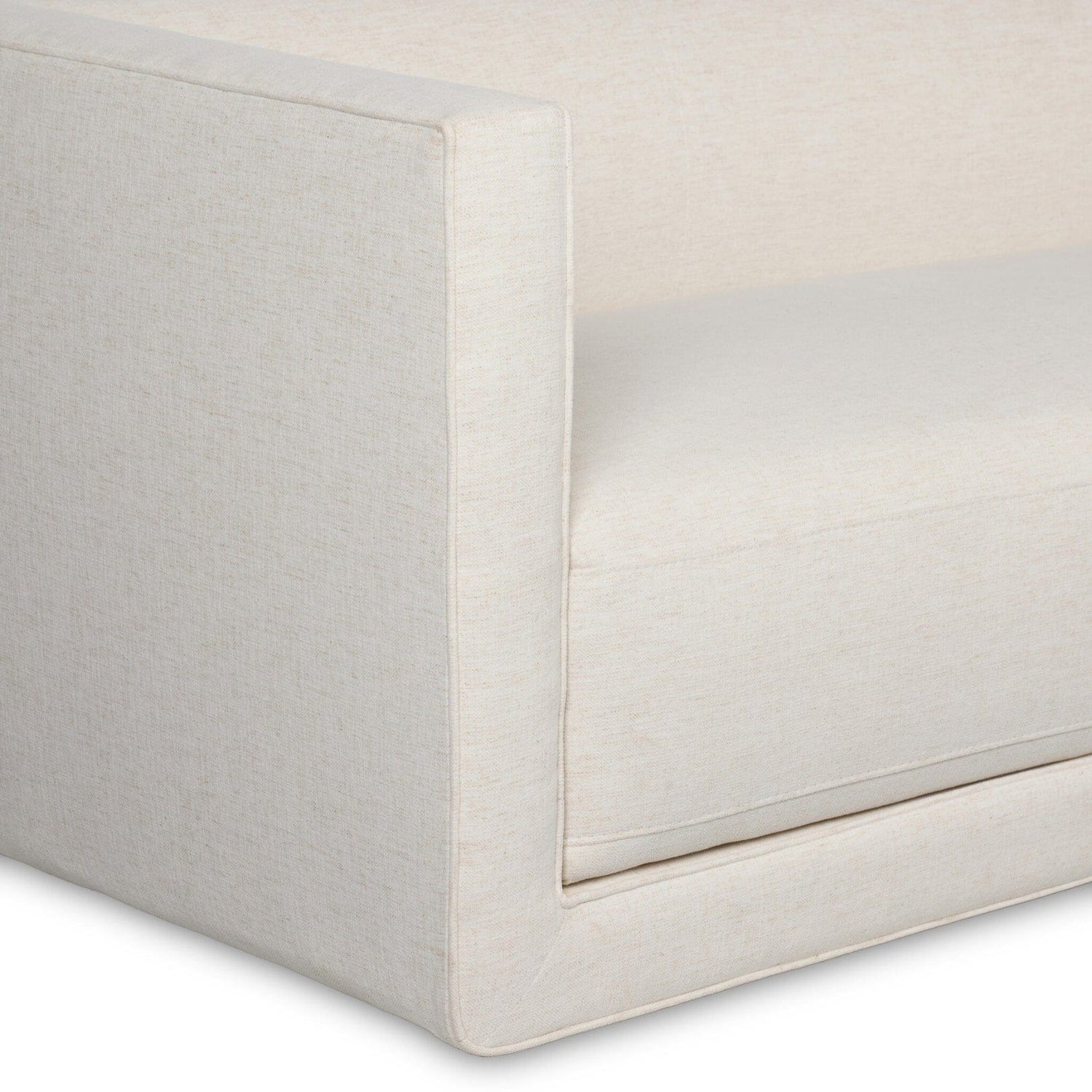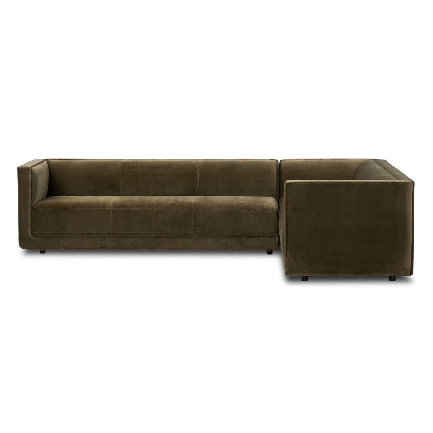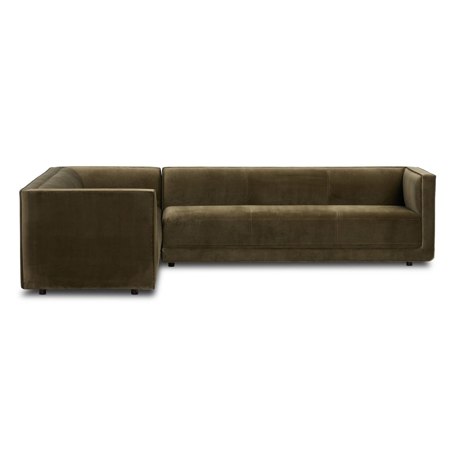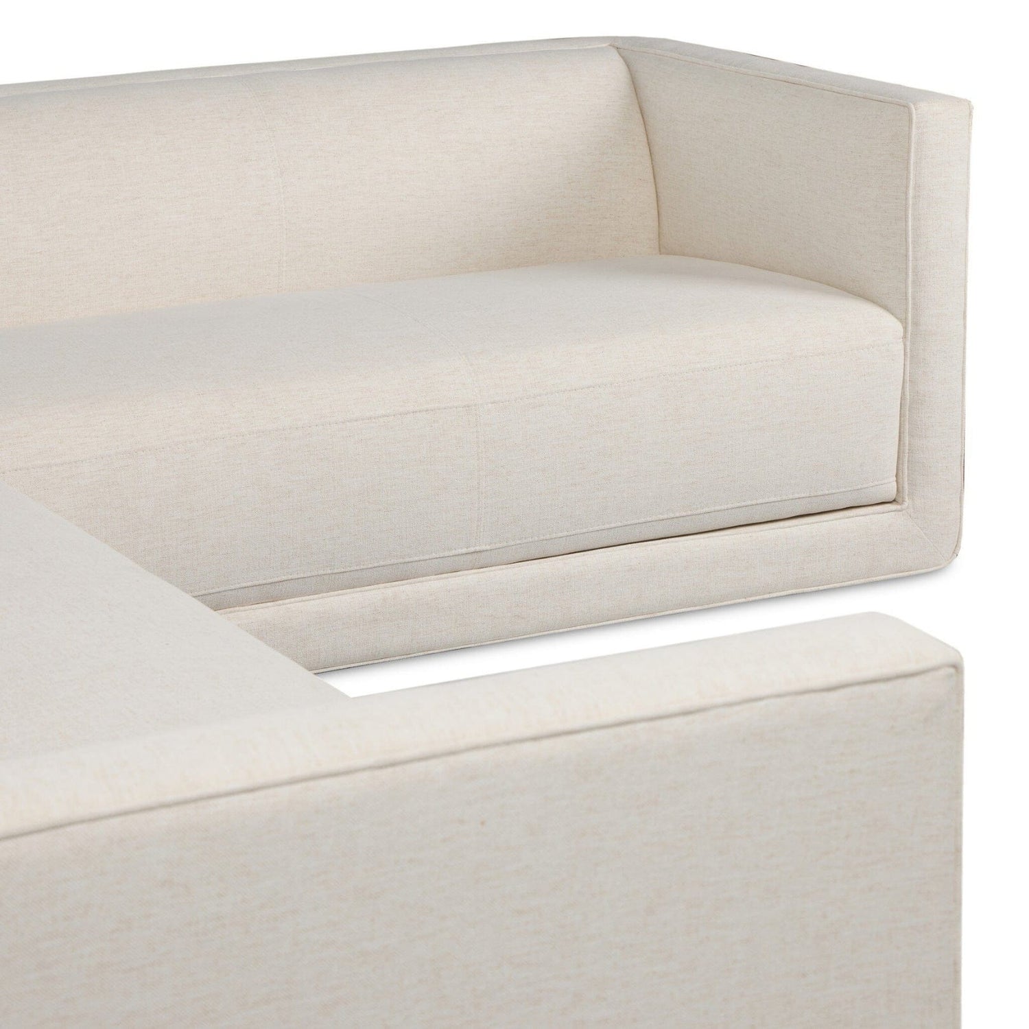 A clean, angular sectional designed with durability for everyday use. The slight pronounced seat cushion creates an illusion of being loose, but is actually a fixed cushion with expert tailoring. A piping channel detail gives the arm a finished look. Upholstered in high-quality fabric—available in a range of colors and materials—this sectional features performance engineering for protection against stains, moisture, and odor, with refined stitching along the seat and back cushions.