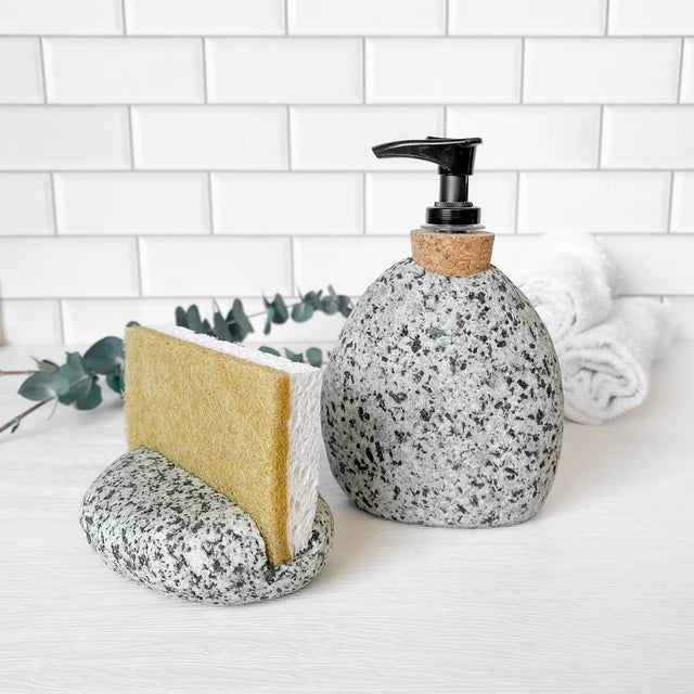 Our Stone Soap/Lotion Dispensers are a fun and funky addition to your kitchen or bathroom. They provide a natural container for liquid soap or your favorite hand cream. The pumps are fastened with a cork stopper that can be easily removed and cleaned. Approximately 5–7" tall with a 1-1/8" hole, holds 6-8 oz.