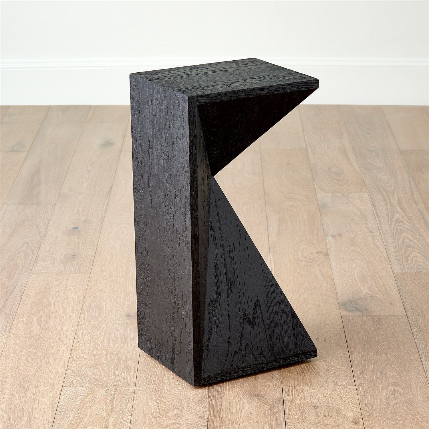 The Asymmetrical Angle Side Table features a modern design in oak with a natural or blackened oak finish, showcasing the beauty of its wood grain. This striking piece adds a unique touch to any living space or bedroom.