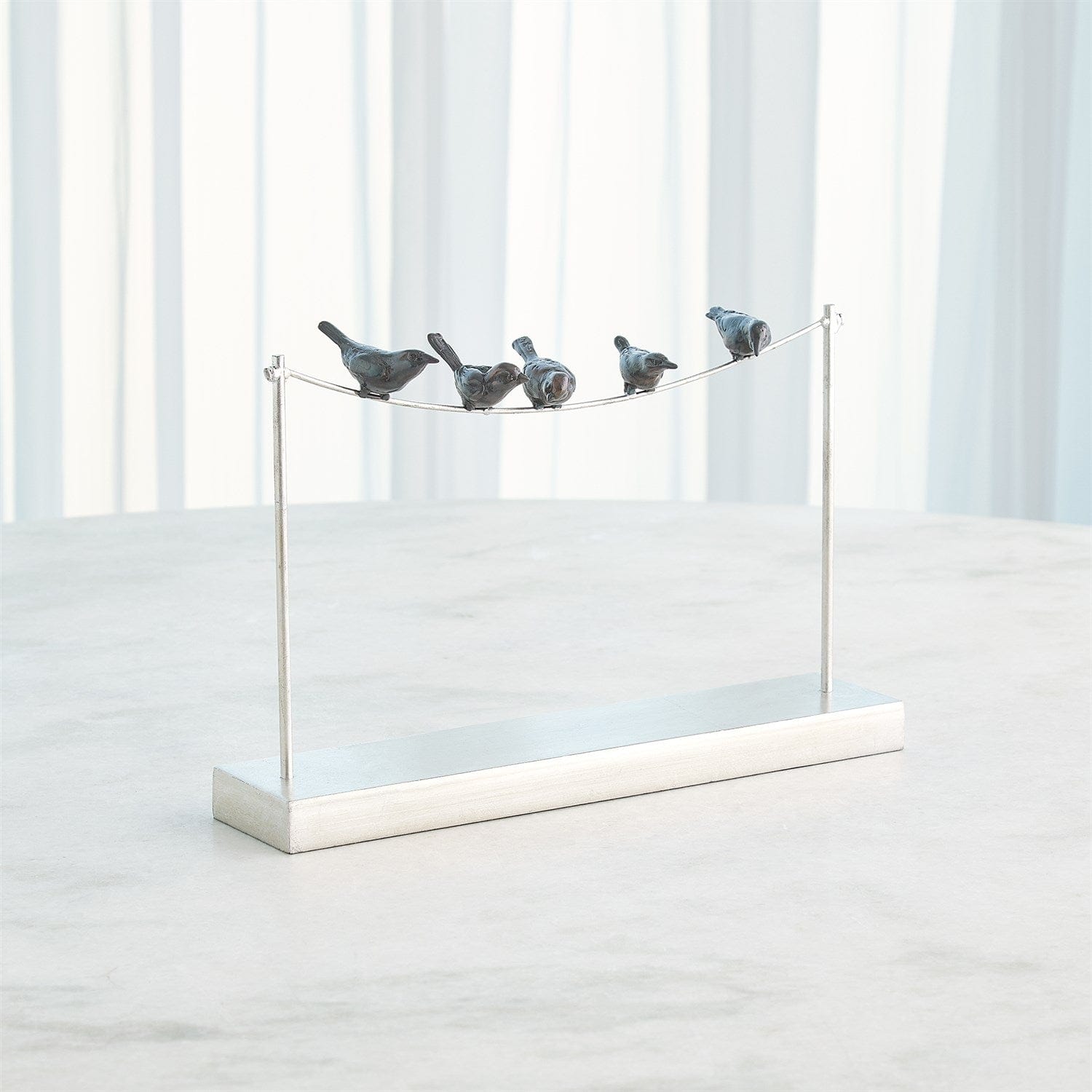 Elevate your decor with the whimsical Birds on a Wire sculpture. Featuring cast iron birds in a rich bronze finish perched on an iron base with hand-painted gold leaf or silver accents, this charming piece adds a touch of delight to any space!