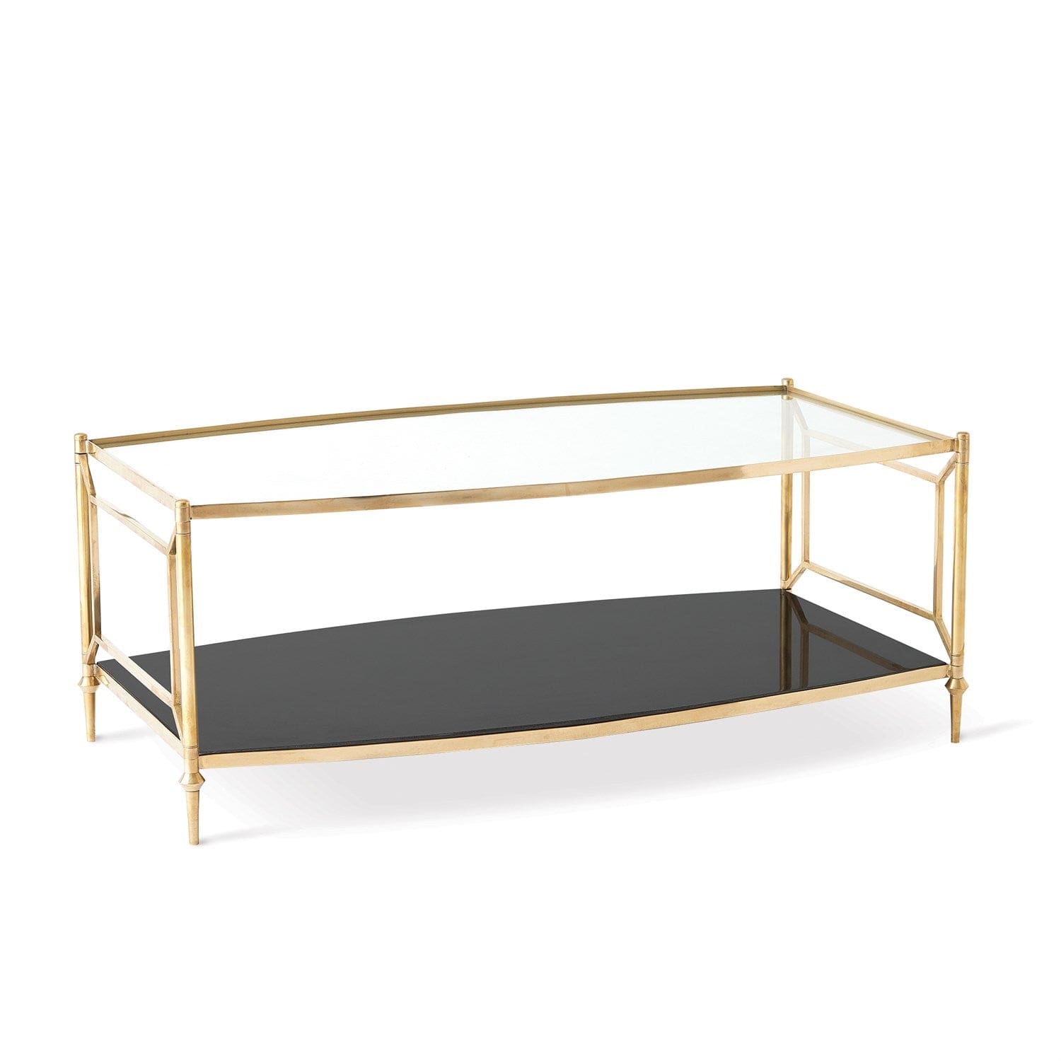 The Camber Cocktail Table showcases sleek lines and a modern design. Crafted with brass and a refined brass finish, it features luxurious black marble and clear tempered glass surfaces, making it a stunning centerpiece for any living space.