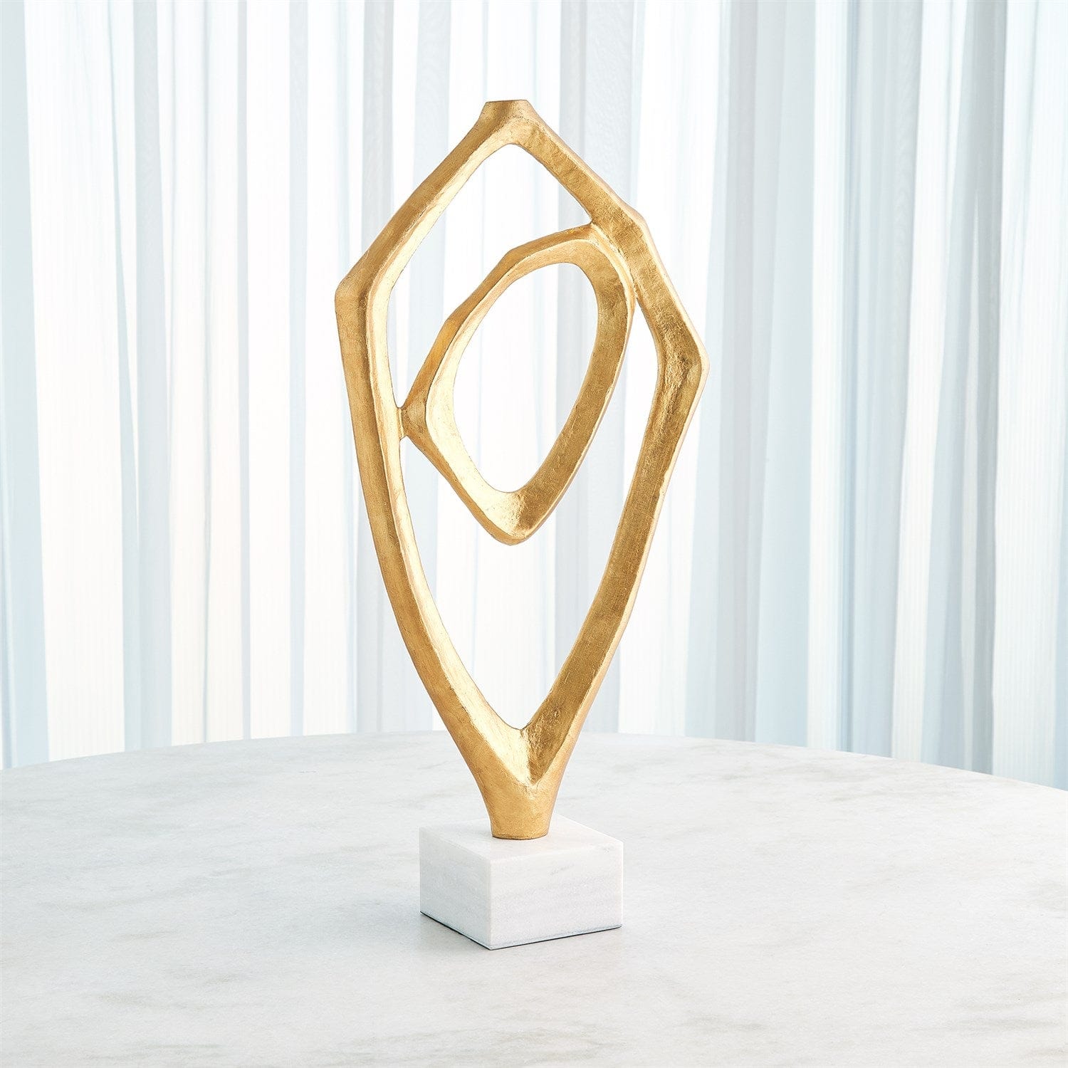 Substantial in size, the Interlude Sculpture is crafted from cast iron with a hand-painted gold leaf finish and elegantly rests on a white marble base.