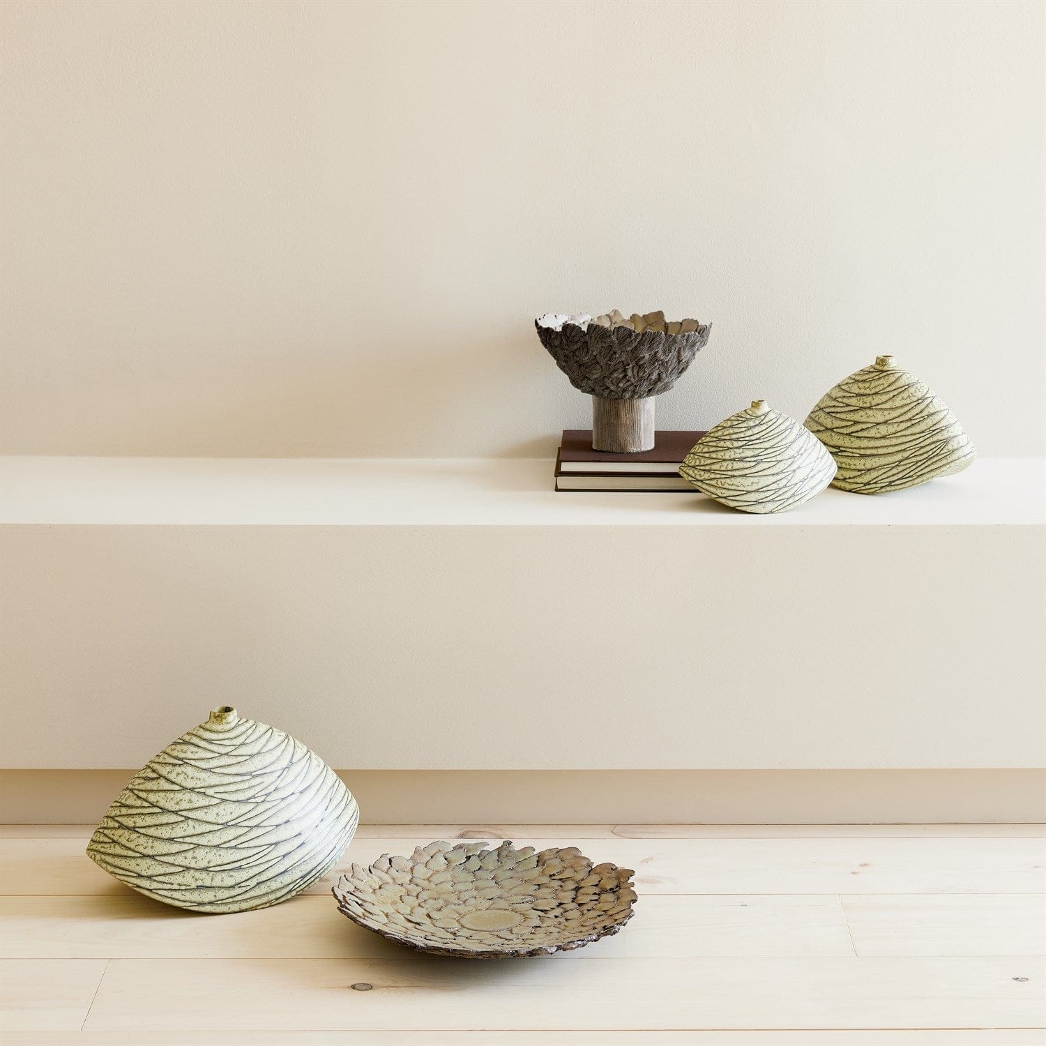 Crafted from slip-molded Portuguese ceramic, the Petaled Pedestal collection features a hand-applied reactive glaze. Each piece showcases textures that beautifully resemble natural elements, adding an organic touch to your decor. Variances in the finishes are a natural result of the reactive glazes and handmade craftsmanship. We celebrate these differences as they give each piece its unique character, making them one-of-a-kind creations.