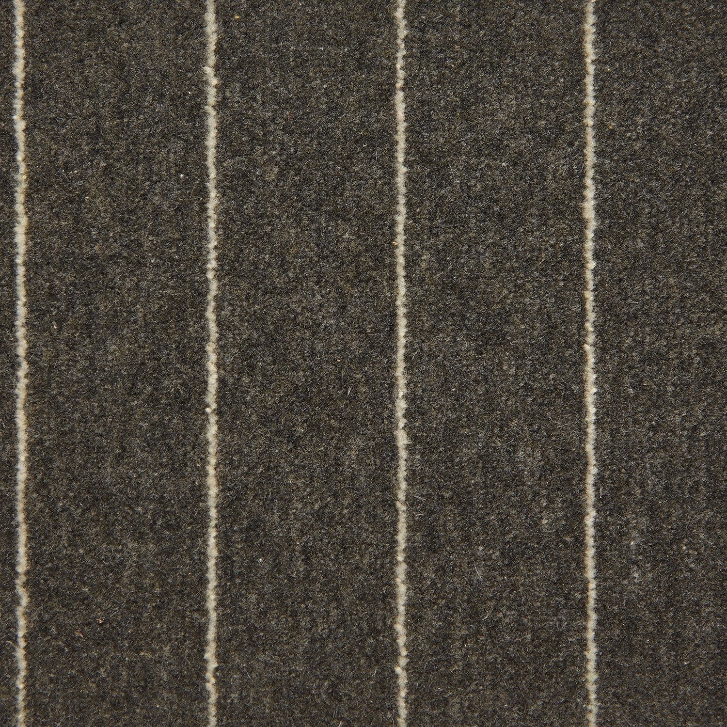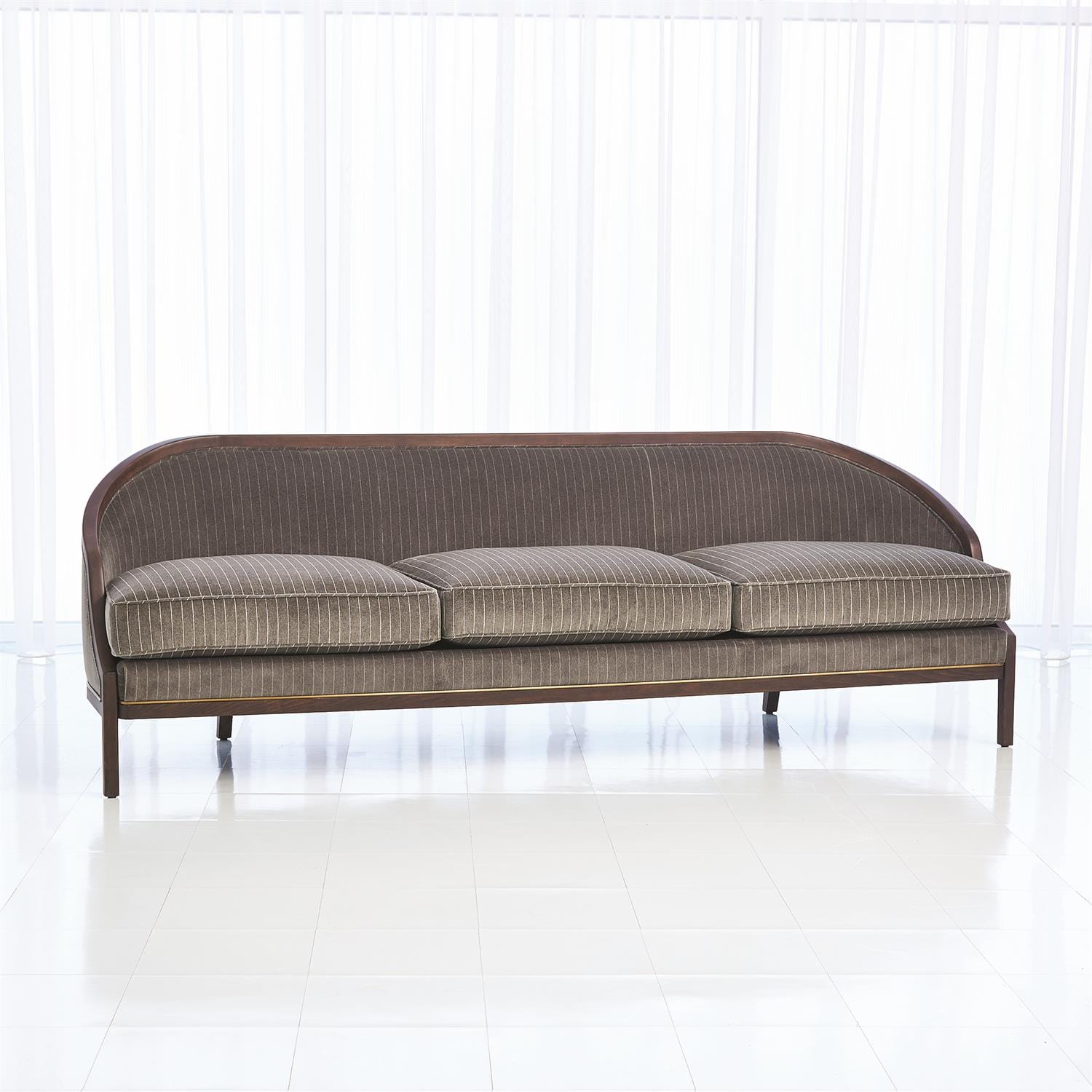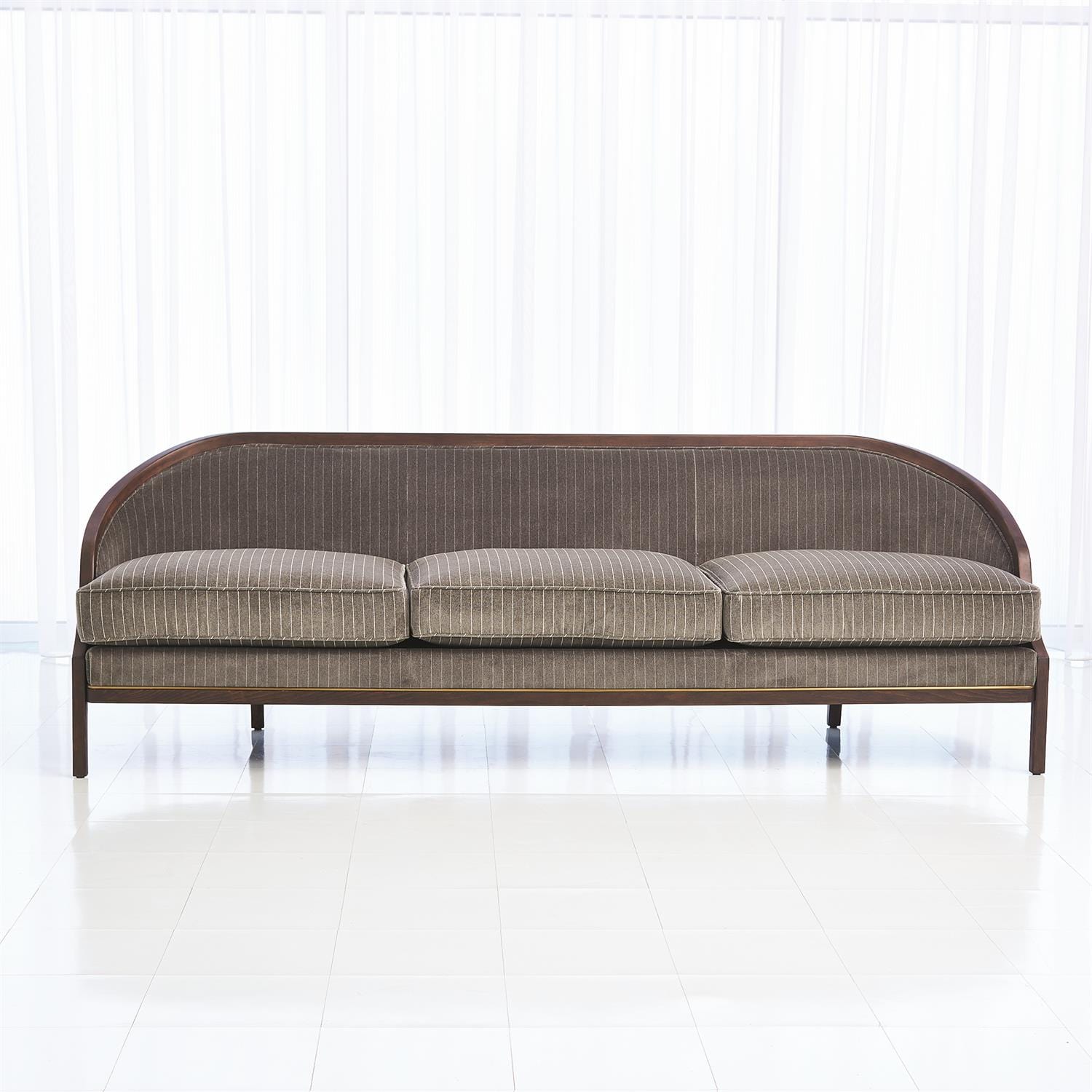 Tailored Sofa is distinguished by the sleek pinstripe fabric around the back support. A beautiful wooden base supports the sofa and is accentuated along the bottom edge with a filet of solid brass running around the entire frame of the sofa. Elegant shapely legs and frame are finished in a dark waxed oiled walnut finish.