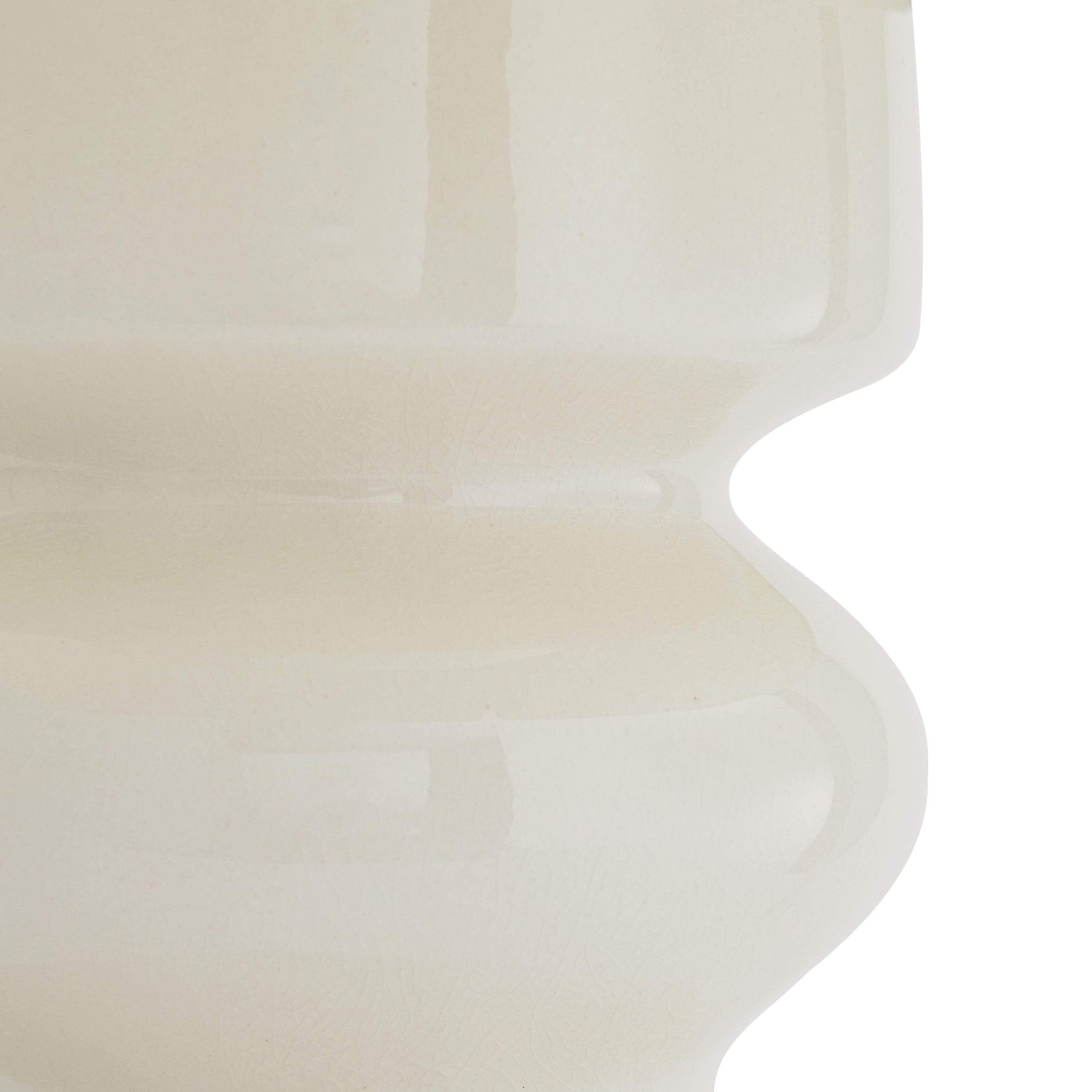Undulating porcelain cylinder shape has been finished with a white crackle. The tall drum white linen shade is lined in white cotton and has a porcelain finial to match.