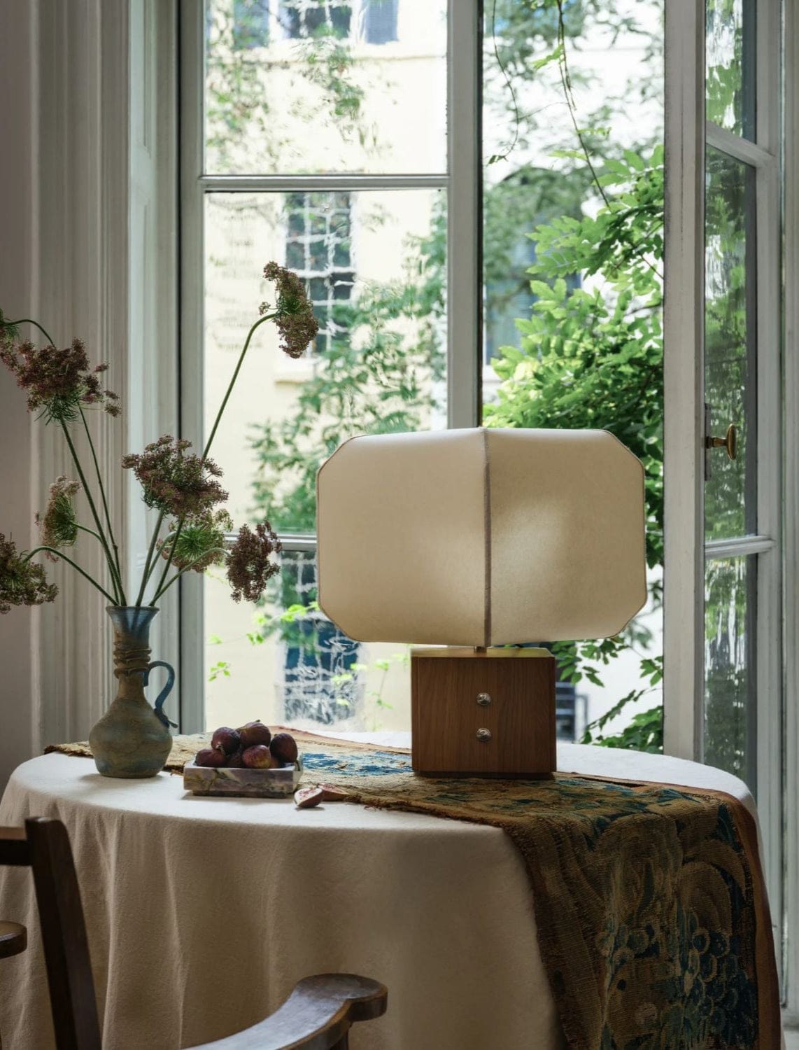Brice is a study in contrast—pairing lightness and structure through a sculptural, design-forward silhouette. A handmade paper voluminous shade, appears to gently billow from its solid white oak base, evoking a sense of quiet movement. Decorative Polished Nickel buttons lend a subtle detail that elevates the piece with just the right edge.