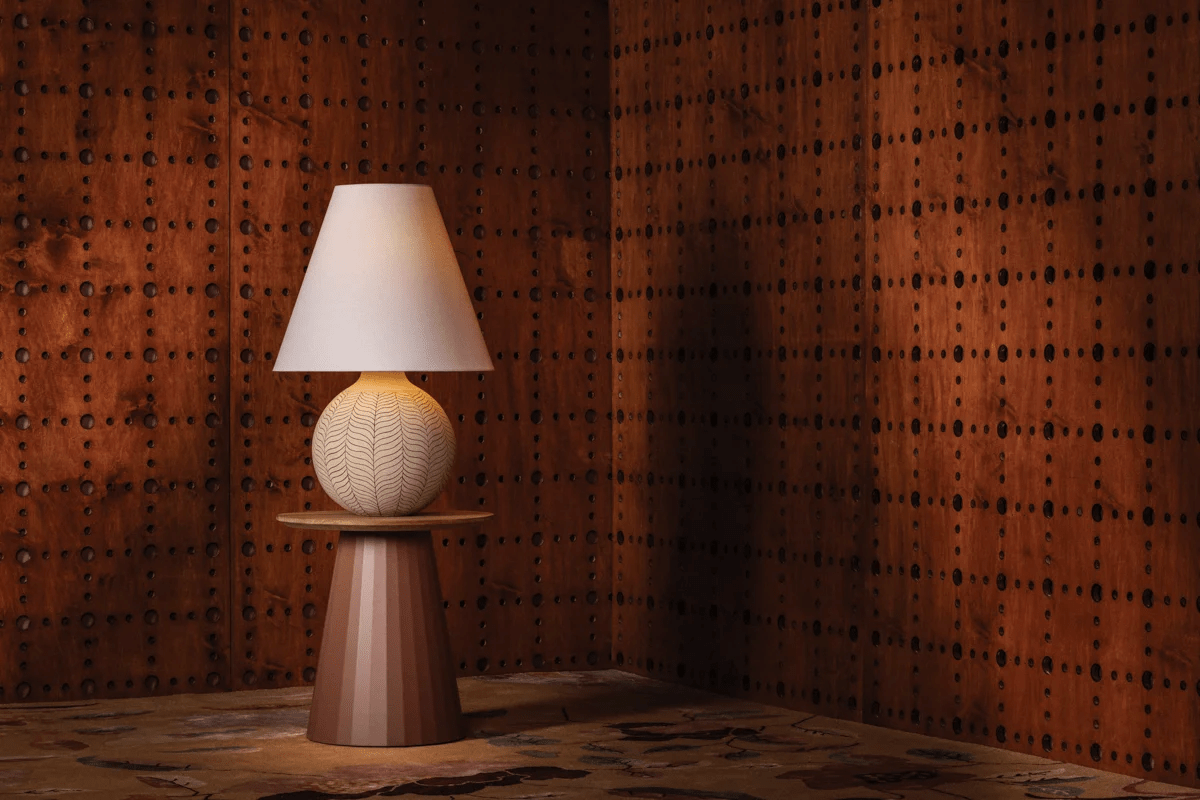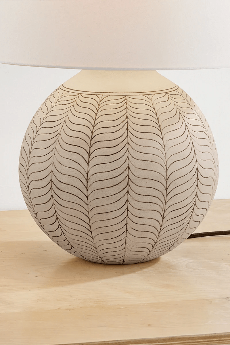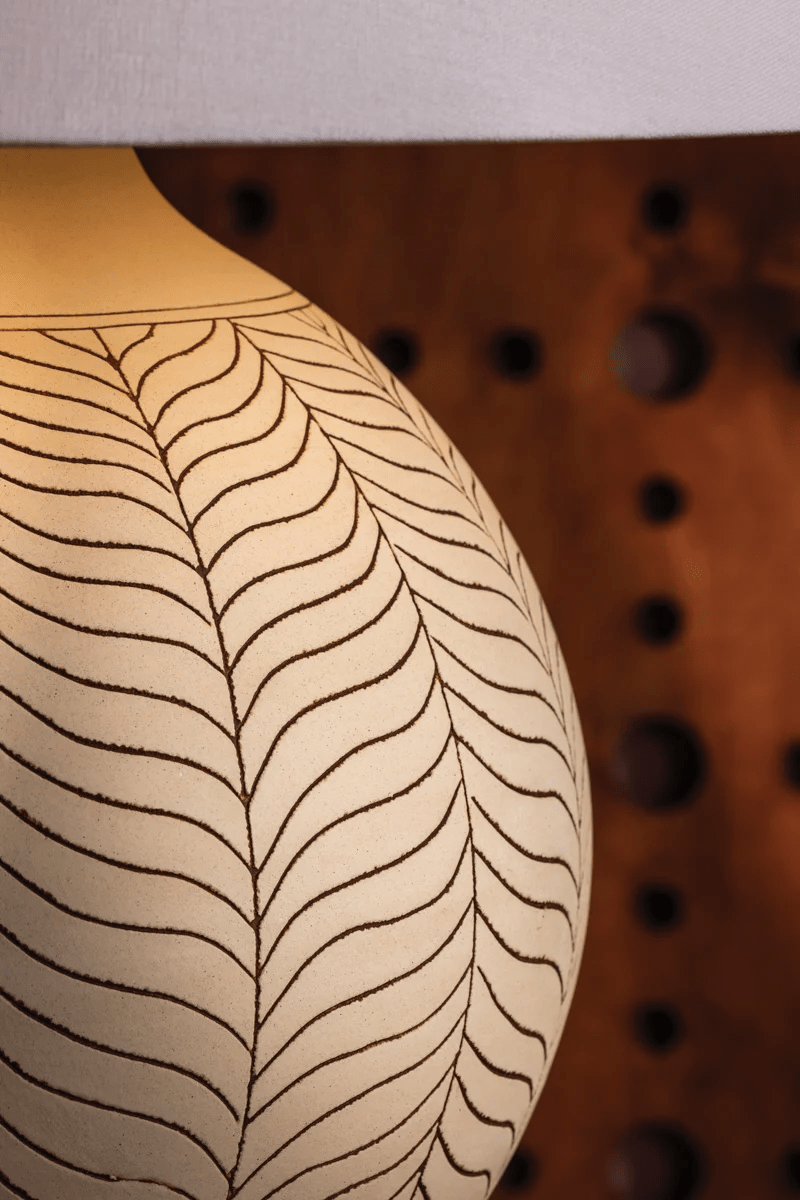 A nod to the pronounced, earthy forms of vintage 1960s lamps, Capers features a decorative botanical motif with a dense, leaf-like repeating pattern. The oversized Ivory Petal Ceramic base exudes a playful presence while the exaggerated scale of the natural linen lampshade pushes the silhouette beyond the expected. With subtle Aged Brass metalwork, Capers balances sophistication with ease as a true signature of this collection.