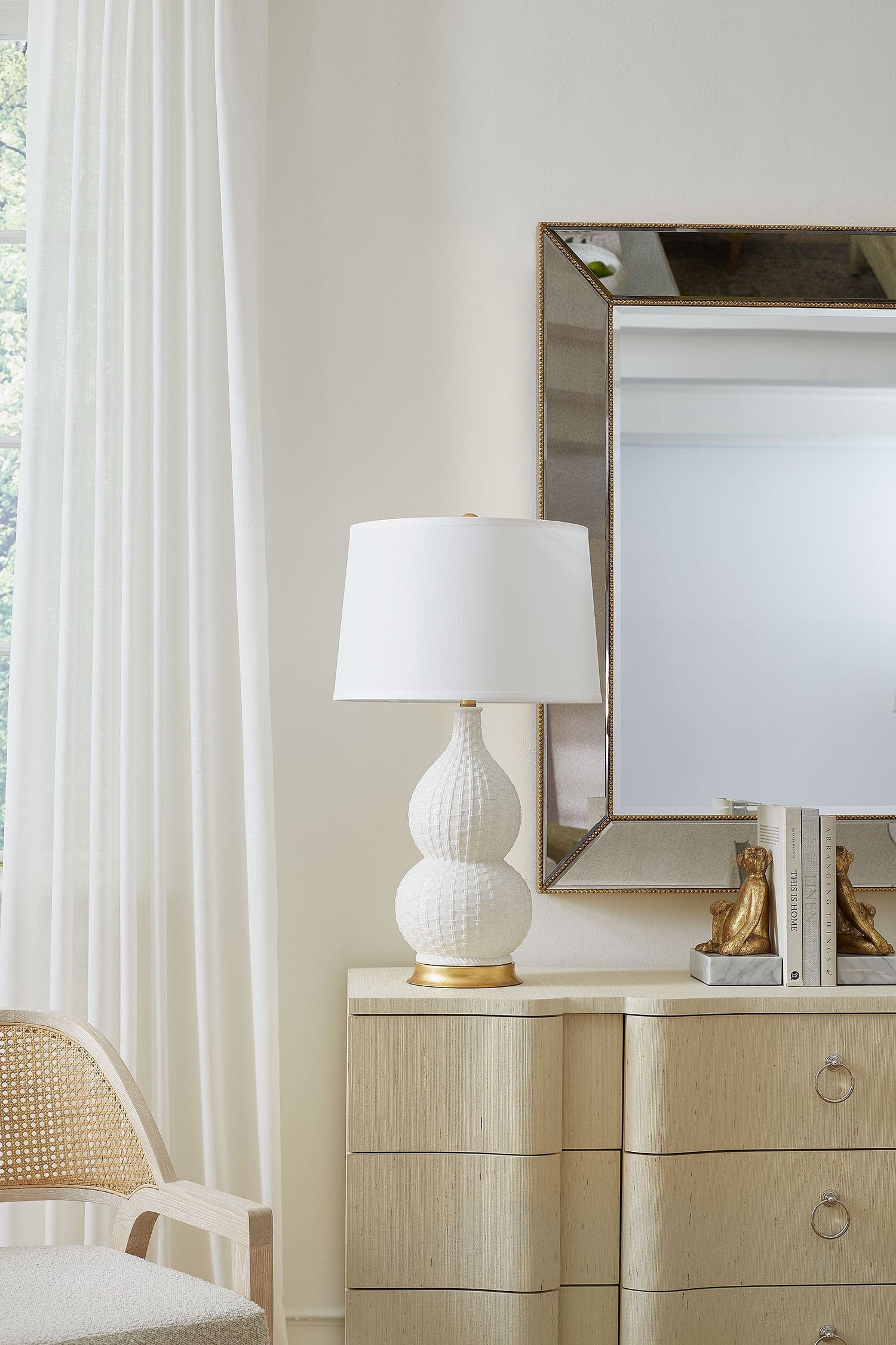 The Charlotte Lamp showcases a refined blend of texture and form with its Blanc de Chine porcelain and intricate basket-weave pattern. It is a sculptural, eye-catching accent for any room.