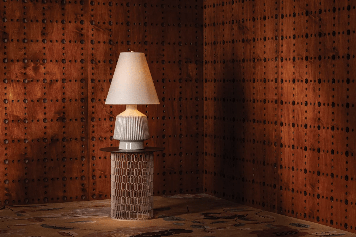 The architectural form and artisanal materiality of the King table lamp engage in a quiet dialogue between lightness and pattern. The Cocoon Ceramic base is accented by symmetrical ridges that add depth and tonal variation. A textured linen shade tops the lamp with even more earth-toned comfort while the Aged Brass hardware adds a glimmer of metal at the neck. King sits proudly in living rooms, studies, or bedrooms, providing a sculptural and grounded ambiance. *Due to the one-of-a-kind nature of the medium, exact colors and patterns may vary slightly from the image shown.