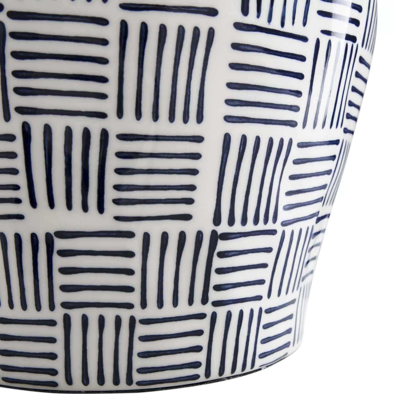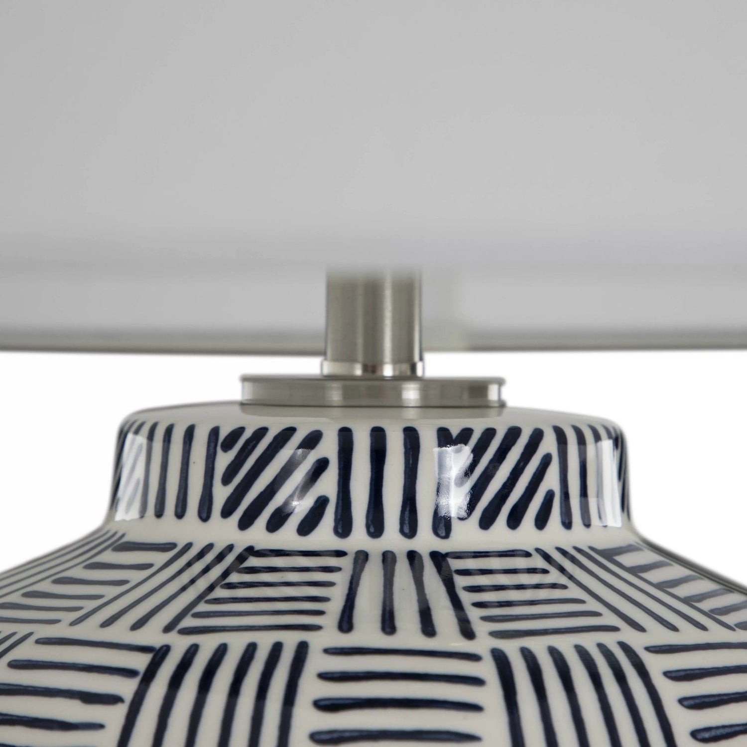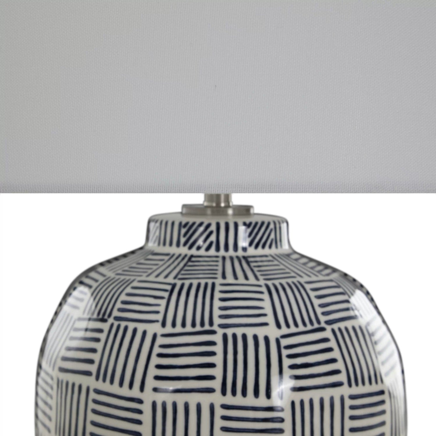 The Liora Table Lamp - Blue boasts a hand-painted ceramic crosshatch pattern in a timeless navy blue and white color...