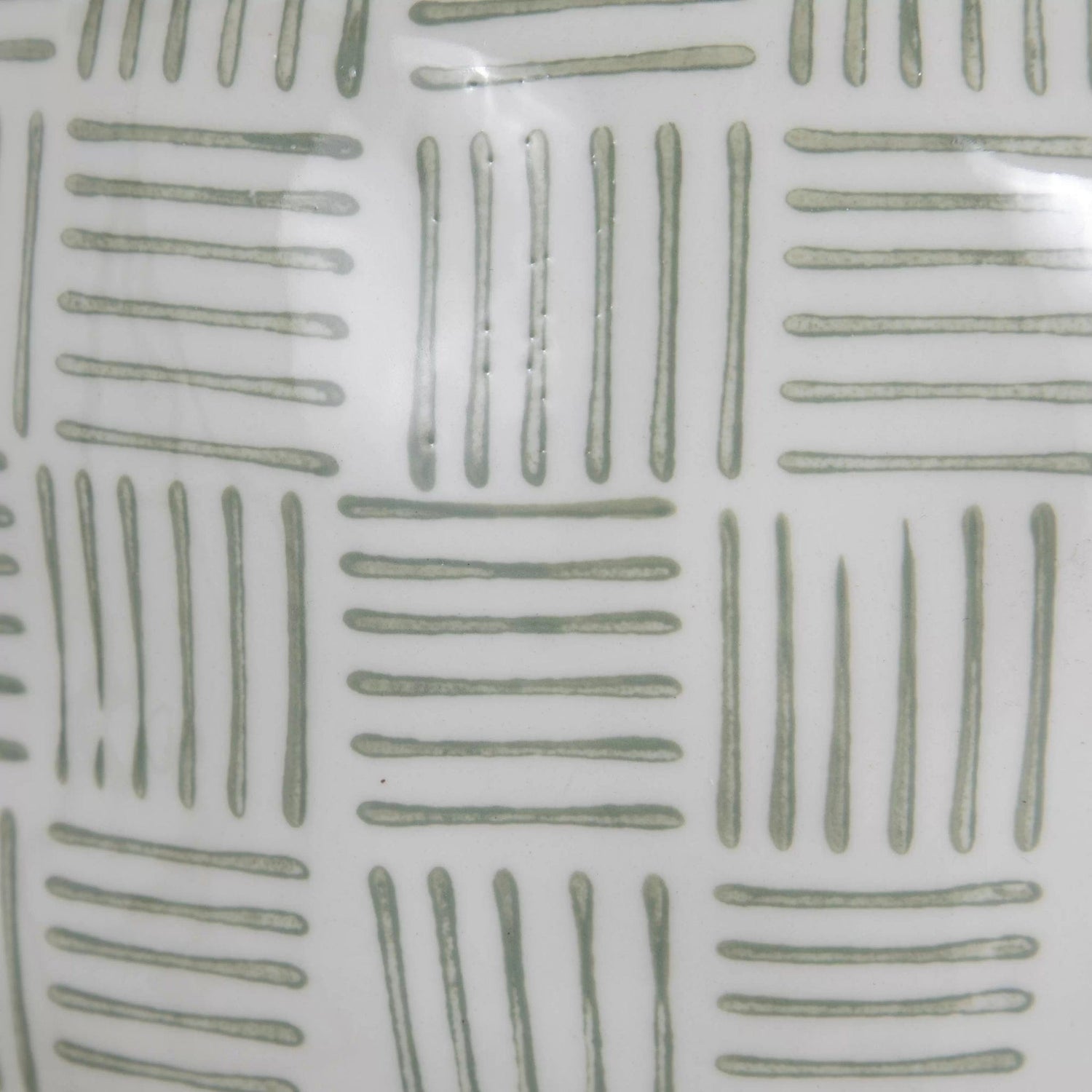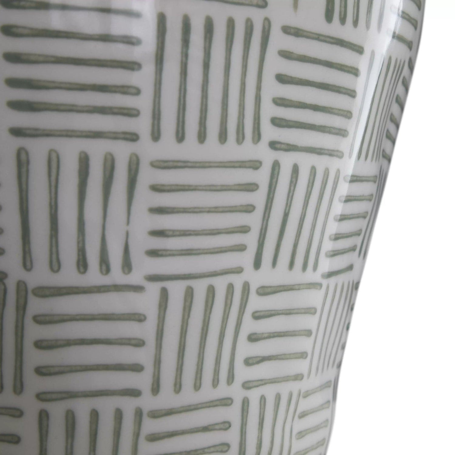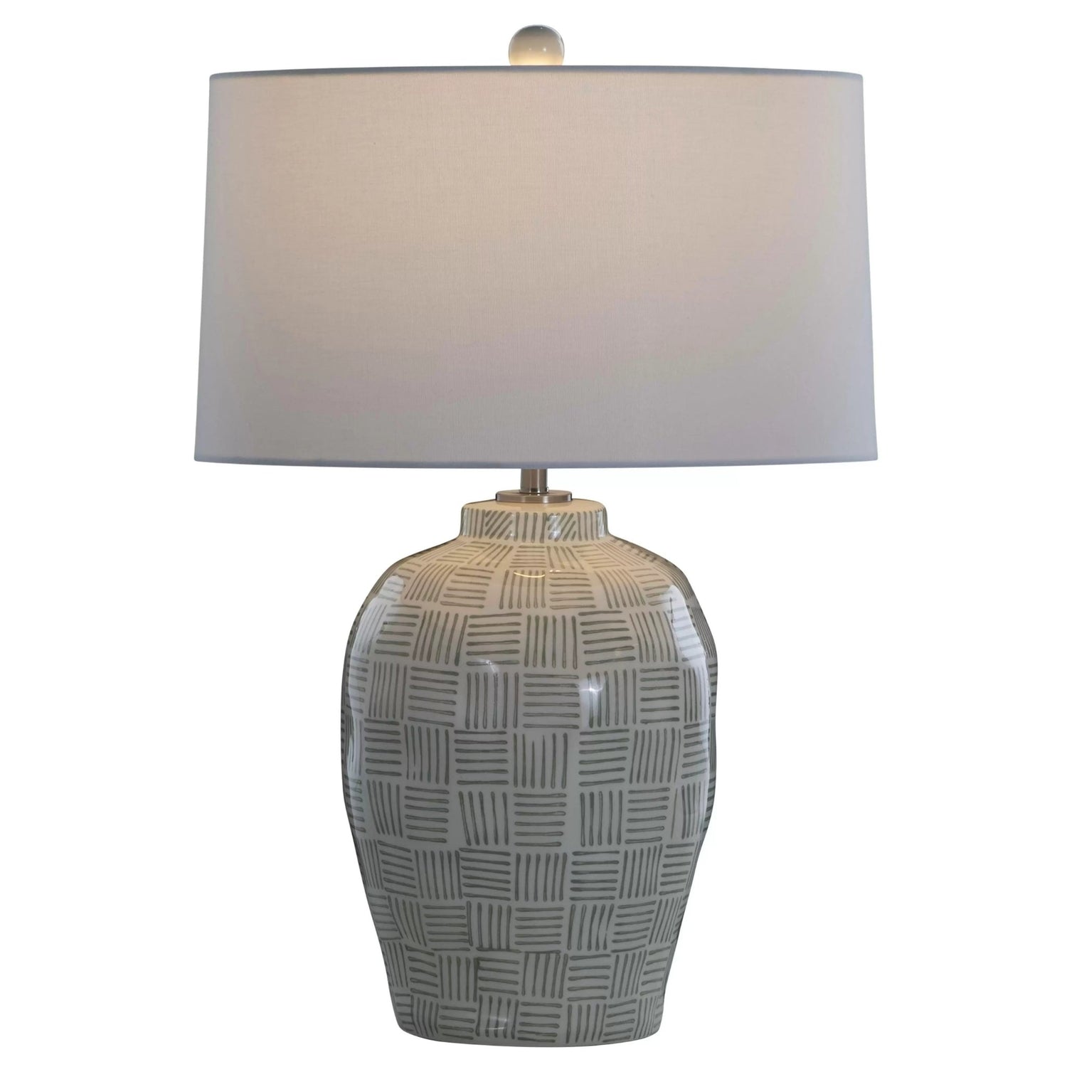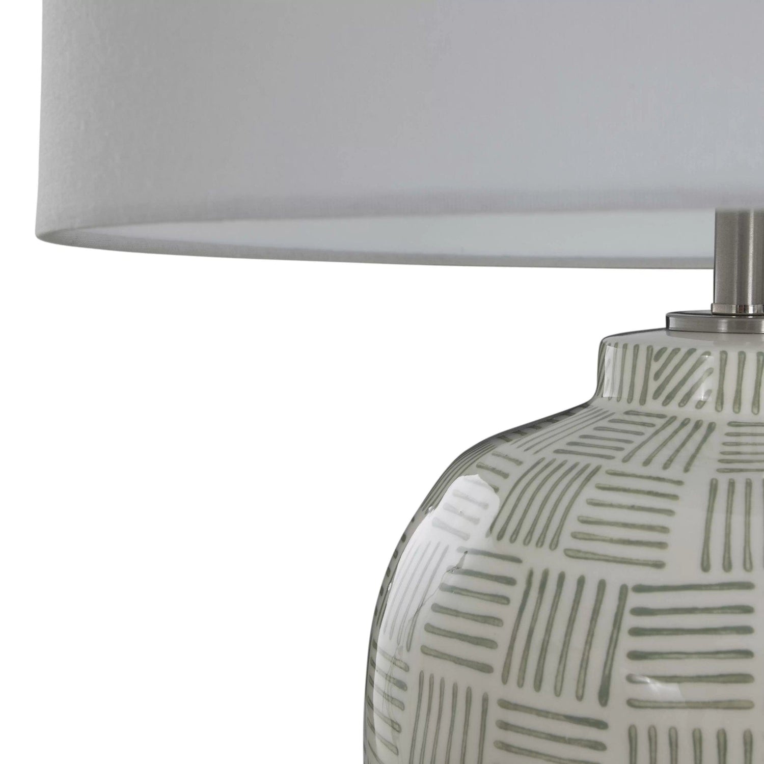 The Liora Table Lamp - Blue boasts a hand-painted ceramic crosshatch pattern in a timeless navy blue and white color...