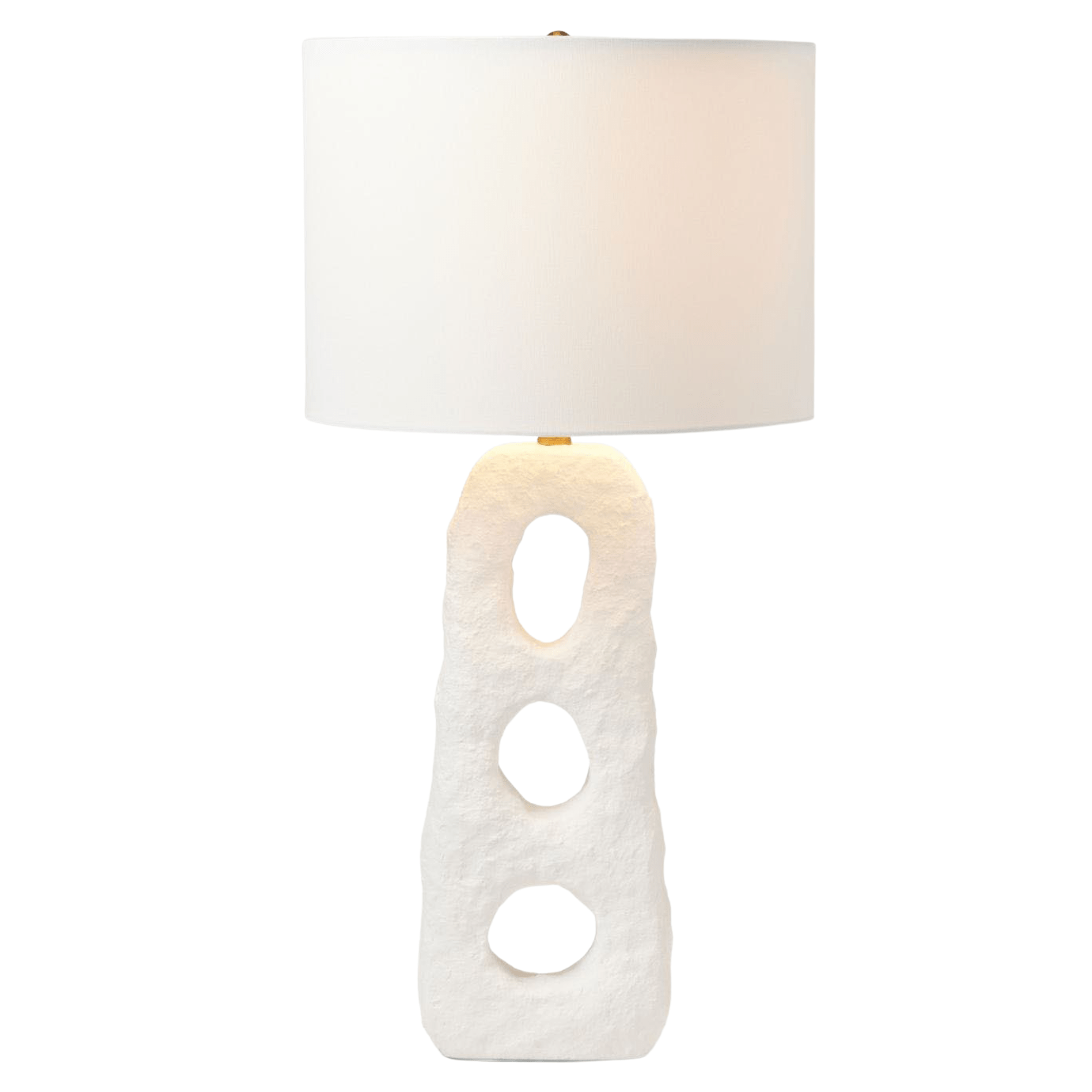 Our modern, elemental Gregos table lamp uses matte white resin to capture the irregular surface and texture of hand-built ceramics. Sculptural cutouts create calming repetition and an airy lightness.