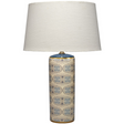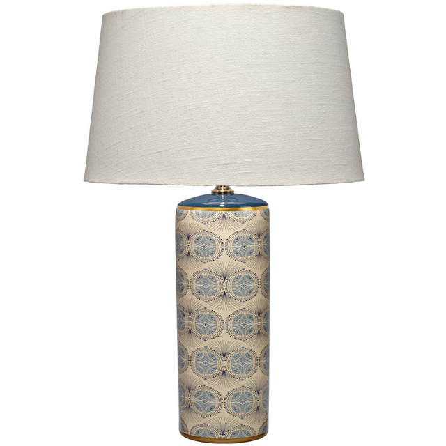 This utterly lovely lamp can brighten and enliven any interior. It features a repeating motif in blue that has been stamped by hand onto a cream-colored base. Its airy palette is accented with touches of gold and warm brass hardware. The included white linen cone shade is topped with a brass ball finial, and the base is lined with black velvet to protect your fine furniture.