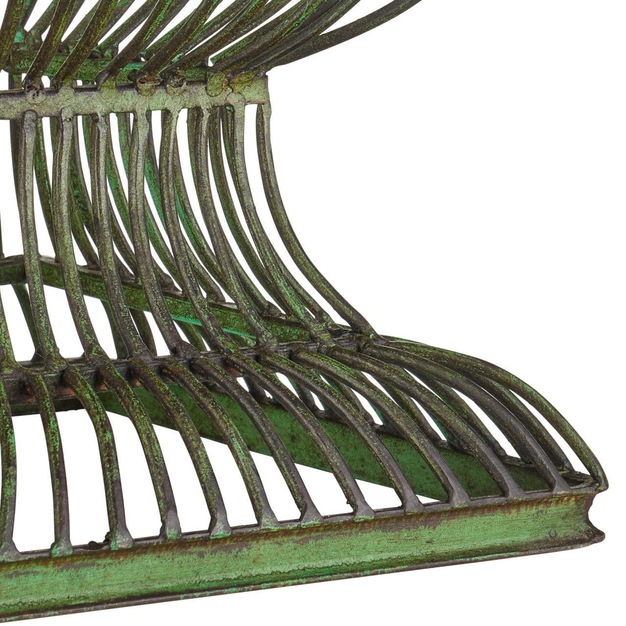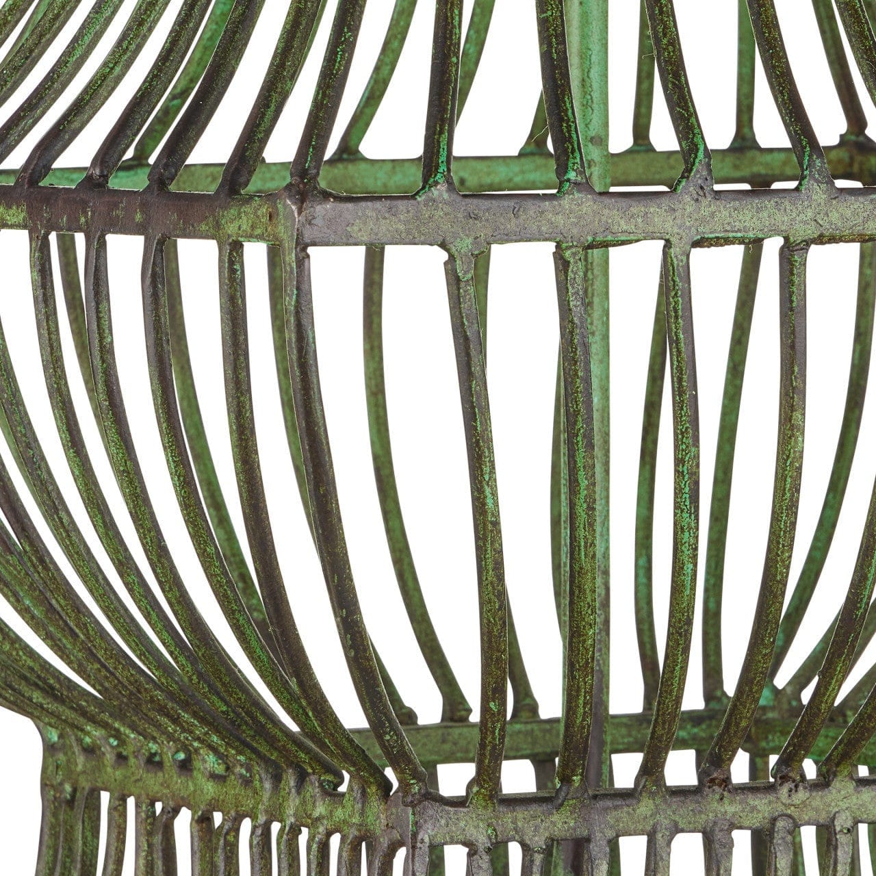 With a profile made of strips of iron that have been finished in a distressed green verdigris, the Tuteurs Table Lamp and its ribbed shade form a shapely cage around the bulb. The complex process required to create this lamp takes painstaking concentration to ensure that the ribs of metal are cut uniformly and applied to the cross-bars consistently. Once in place, the entire green lamp is hand-finished. The material and the distressing call to mind an antique garden artifact. Due to the artisanal finish, the surface of each lamp could differ slightly.