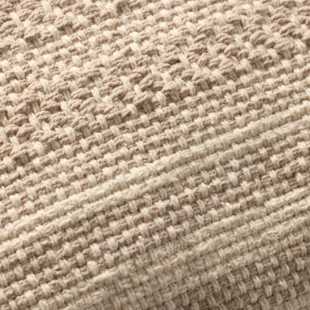 Blair is a richly textured beige throw pillow with subtle stripes, designed by Amber Lewis x Loloi for a range of home decor styles, from coastal to organic modern. The pillow cover is hand-woven of cotton in India and measures 22” x 22”, a versatile size for living rooms and bedrooms.