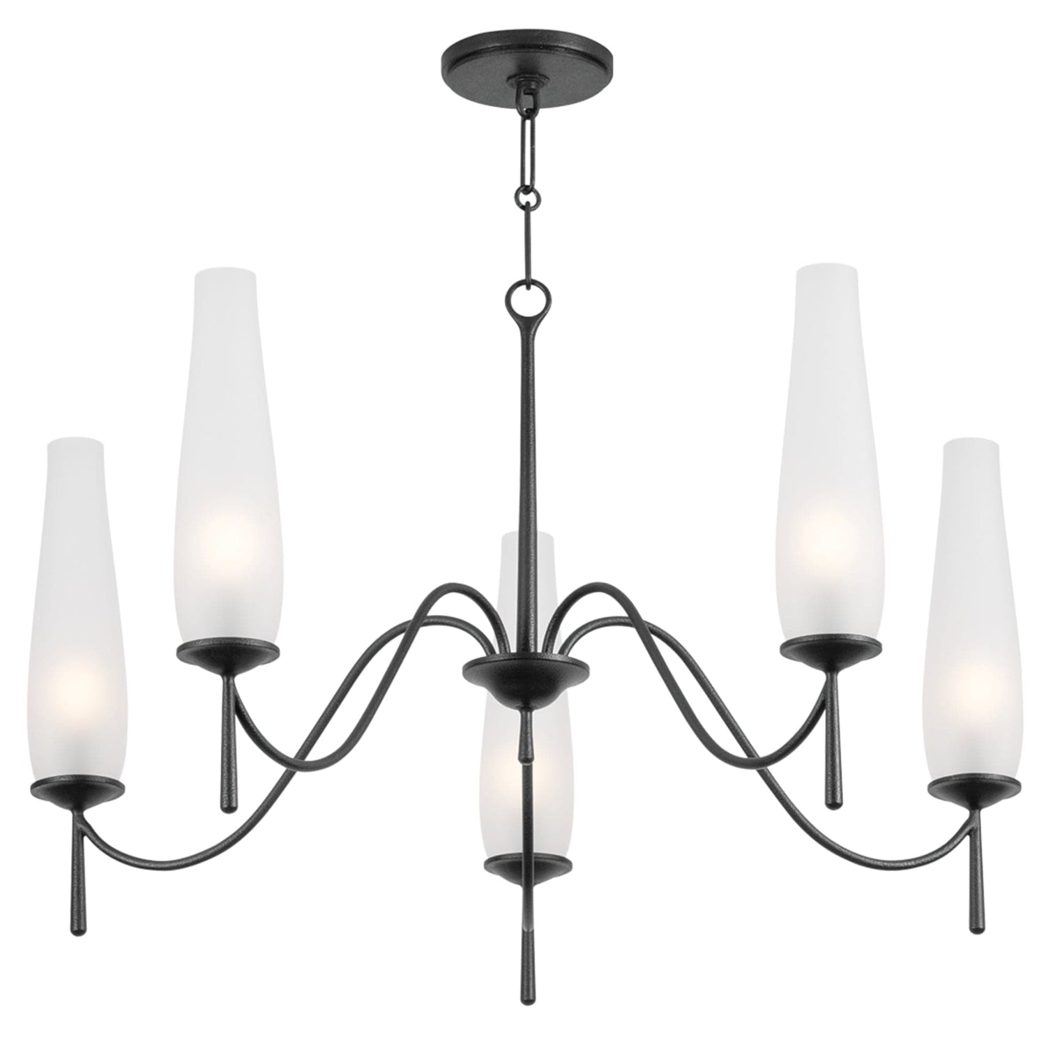A refined take on the classic hurricane lamp, Legacy pairs gracefully curved arms with a rich wrought iron finish. Clear glass shades are etched on the inside to create a translucency that softens the light. Antique-inspired tail details add a touch of historic charm.