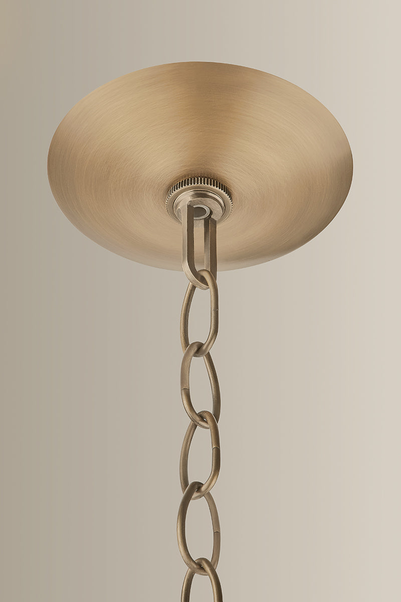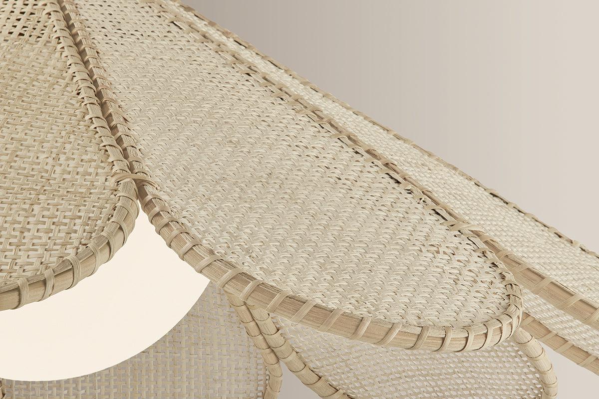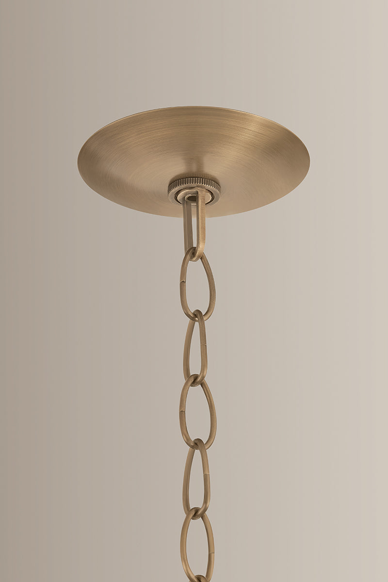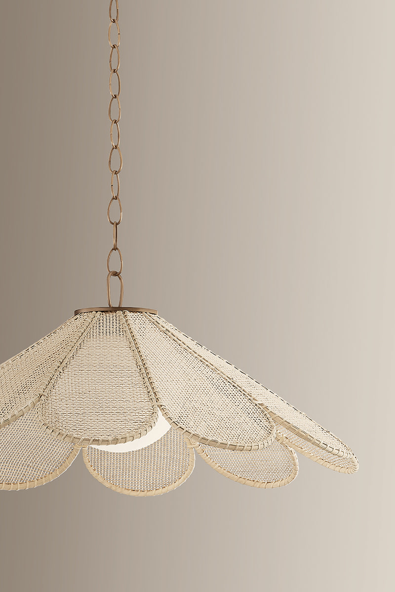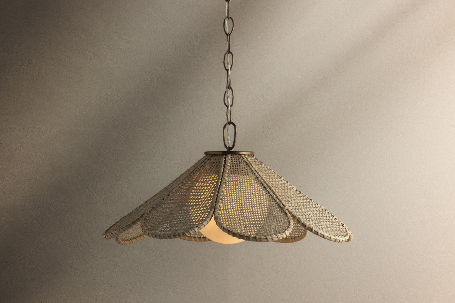 A nod to nature’s quiet beauty, Petal features handwoven rattan cane shaped into delicate “petals” that surround a shiny opal glass globe. The organic silhouette—both rustic and refined—is suspended by a bold loop and chain in Patina Brass (PBR). Available in two sizes, it’s a charming addition above a kitchen island or breakfast nook.