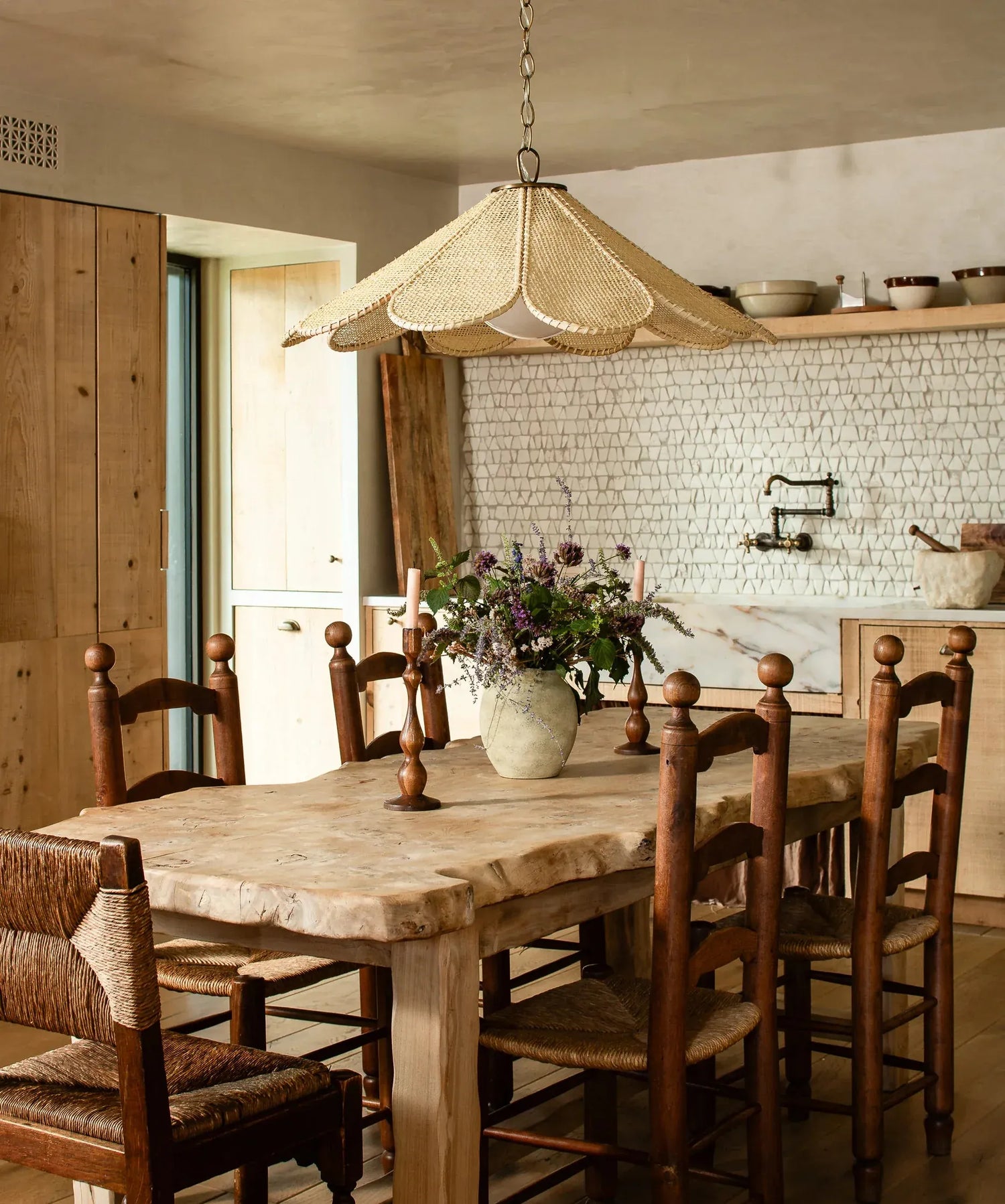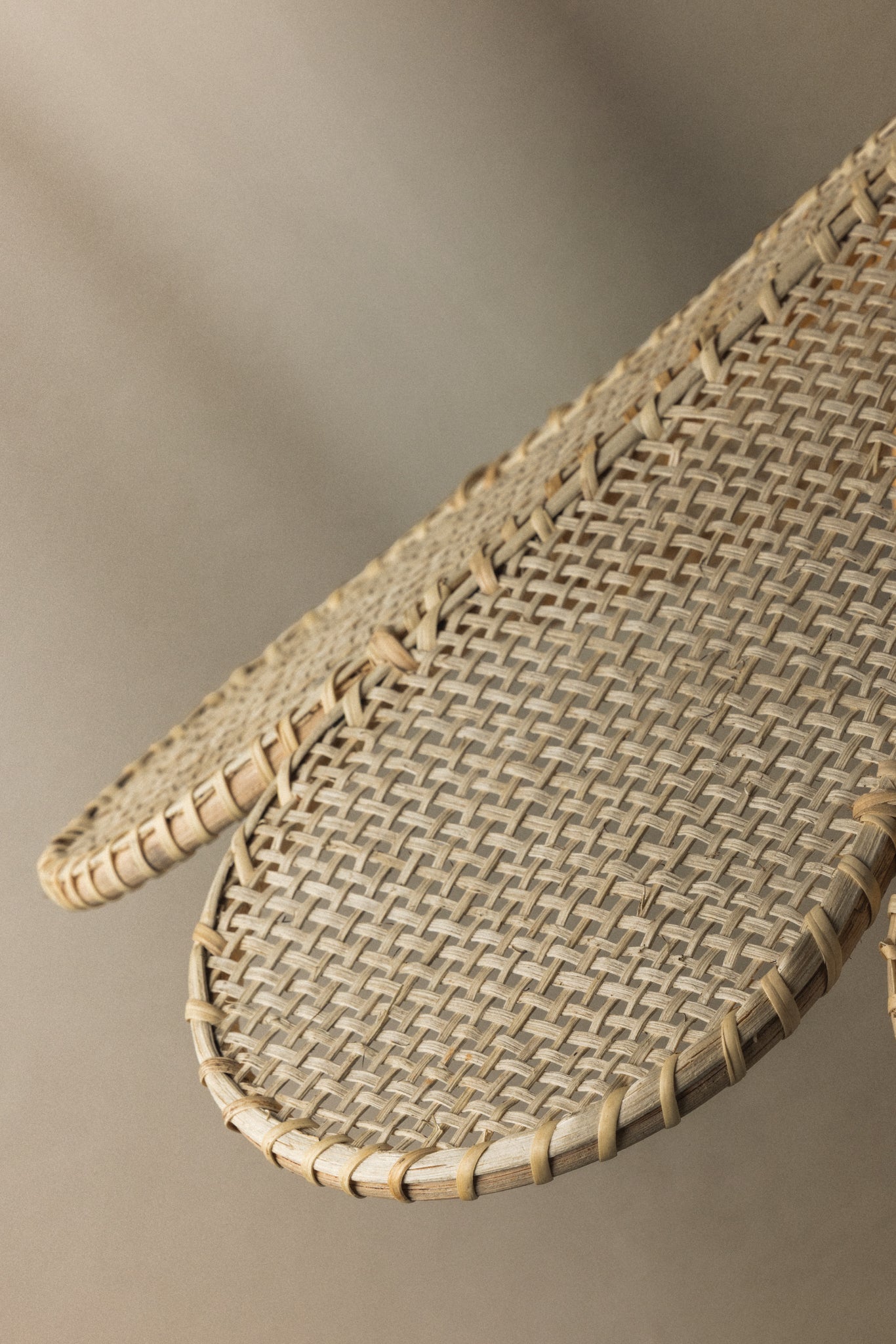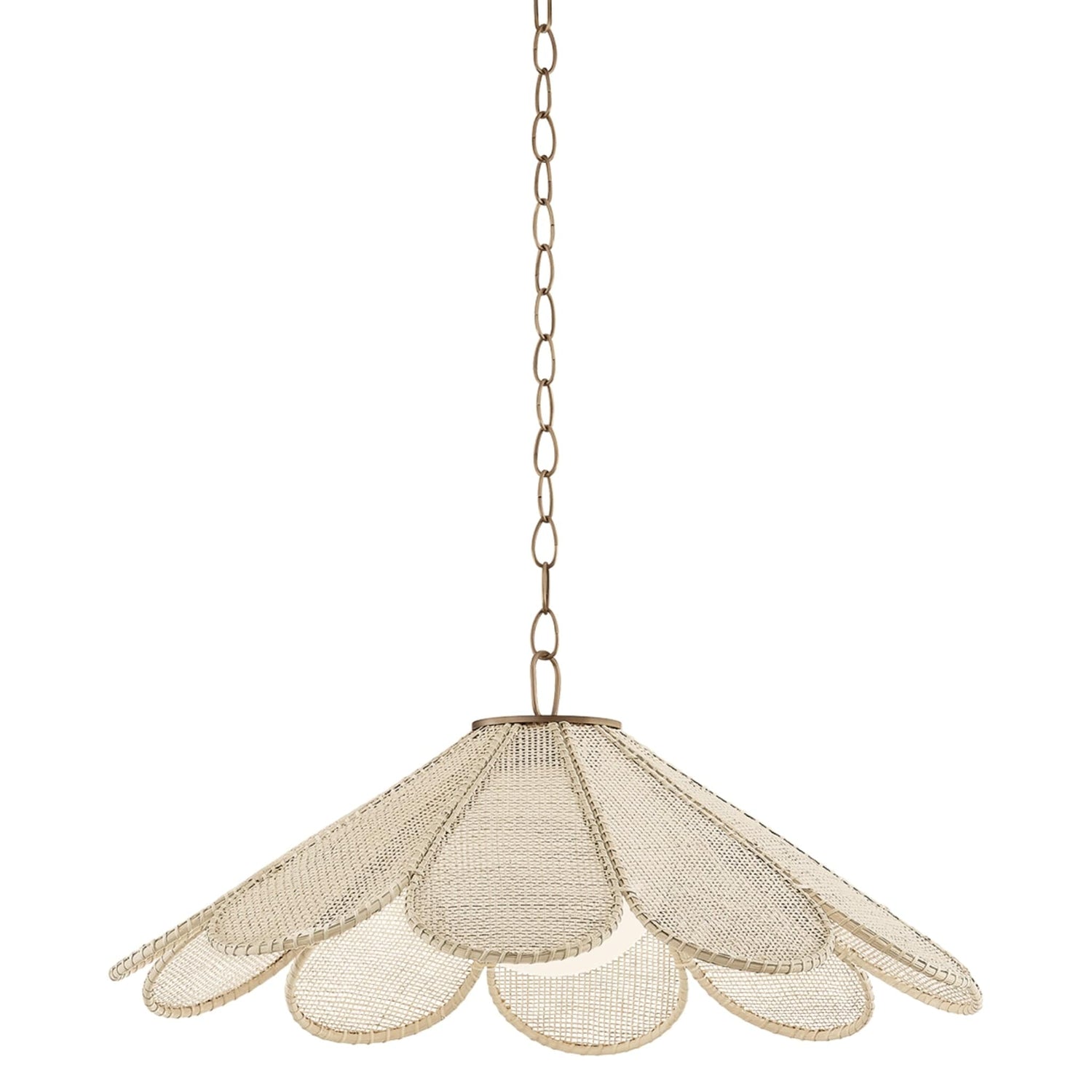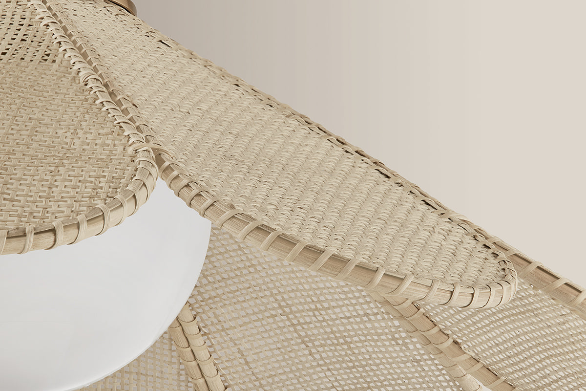 A nod to nature’s quiet beauty, Petal features handwoven rattan cane shaped into delicate “petals” that surround a shiny opal glass globe. The organic silhouette—both rustic and refined—is suspended by a bold loop and chain in Patina Brass (PBR). Available in two sizes, it’s a charming addition above a kitchen island or breakfast nook.