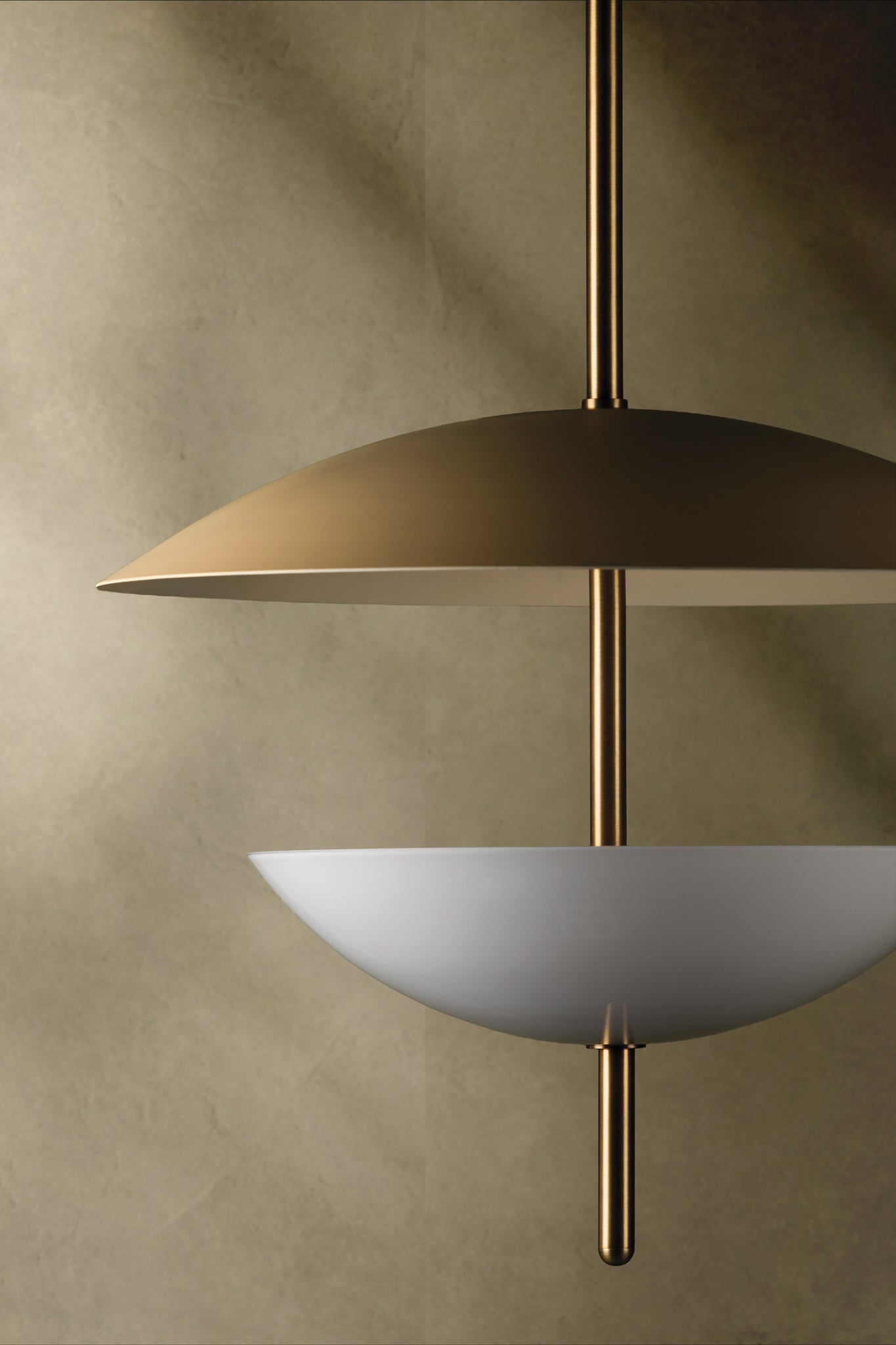 Dion captures modern organic design with its round, slender Patina Brass rod that pierces through a pair of domed shades in warm, neutral tones. The opal glossy glass shade below fills with a soft glow and casts an uplight that reflects off of the larger Soft Sand dish above. This pretty pendant defines subtle sophistication.