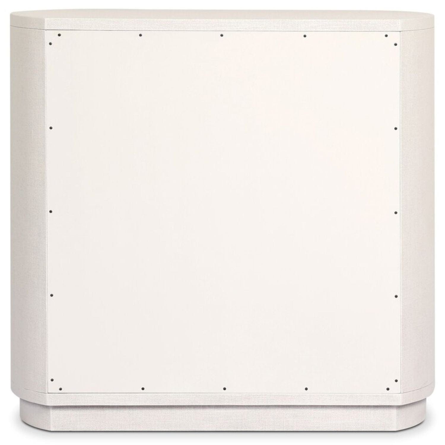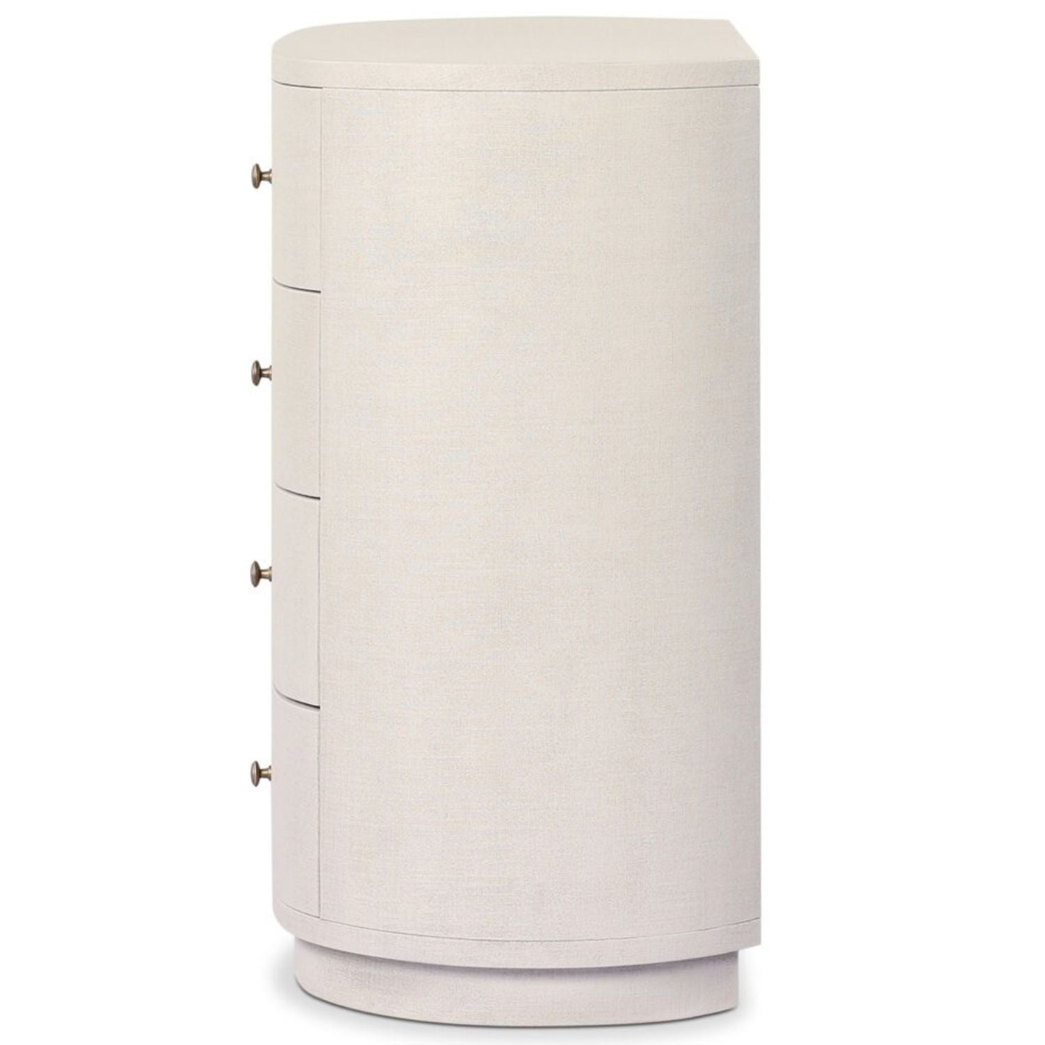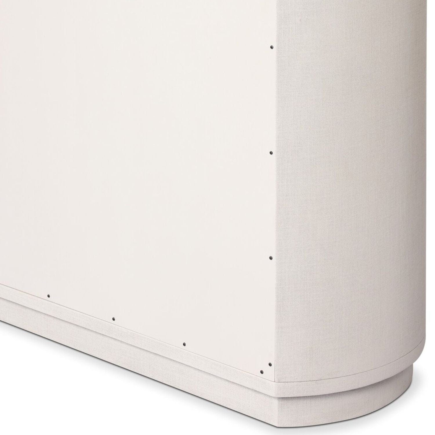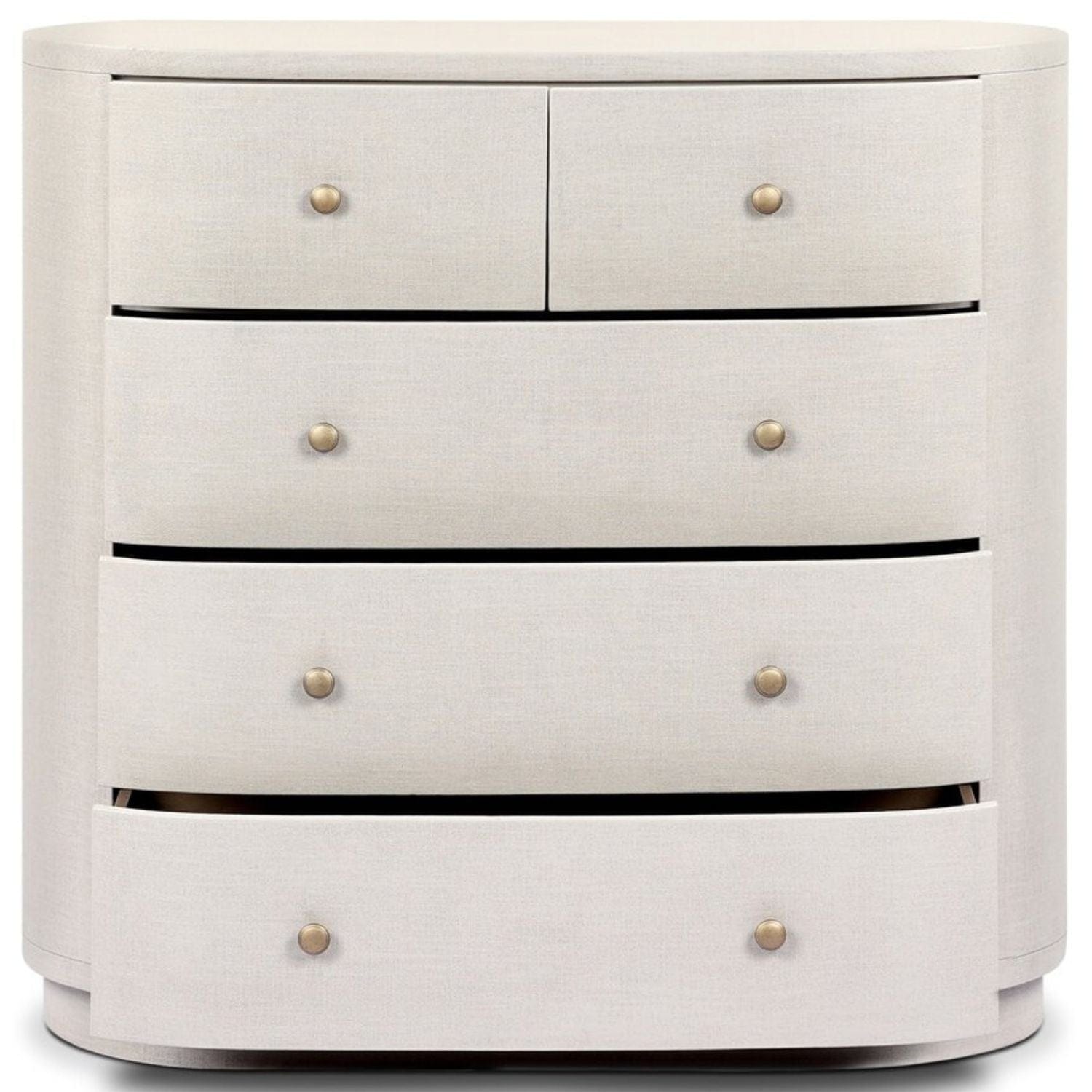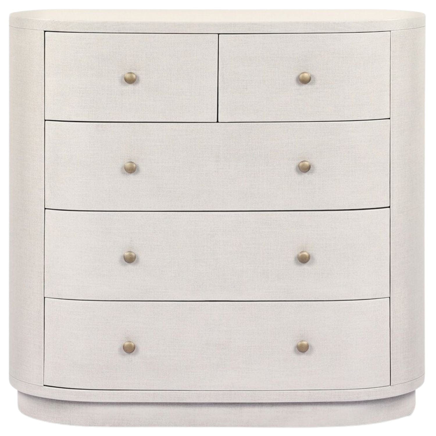 Uniquely made from ivory-painted linen, a beautifully curved drawer chest gives shape to generous storage for clothes, accessories and more.