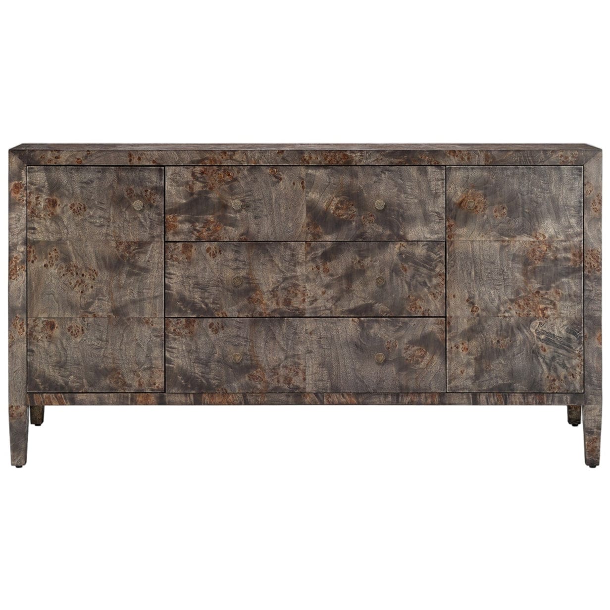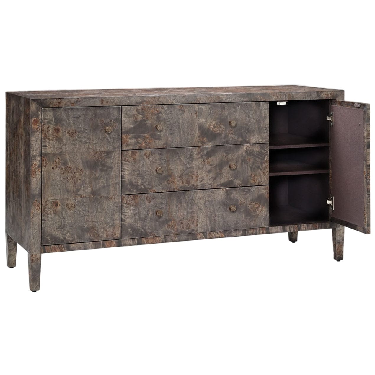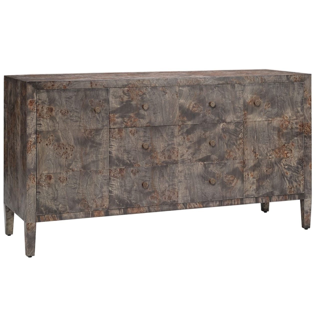 Made from naturally contrasting mappa burl and a sleek knob per drawer, this piece is as elegant as it is functional. Given the nature of the material, each pattern is one-of-a-kind.