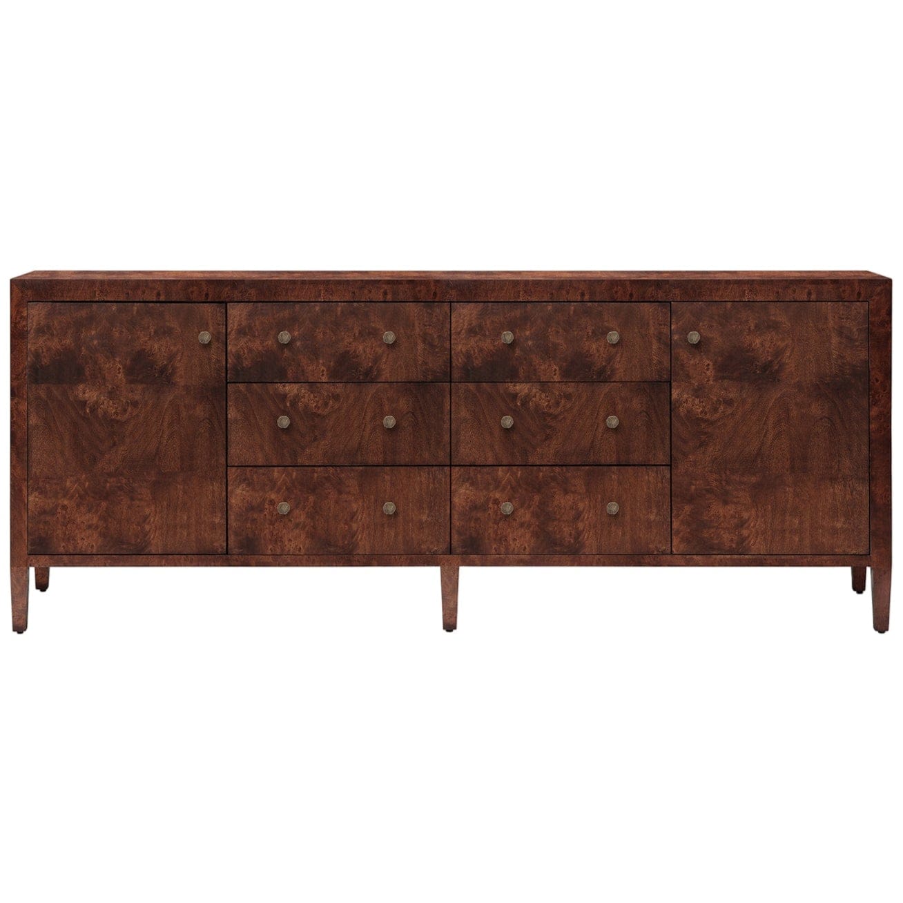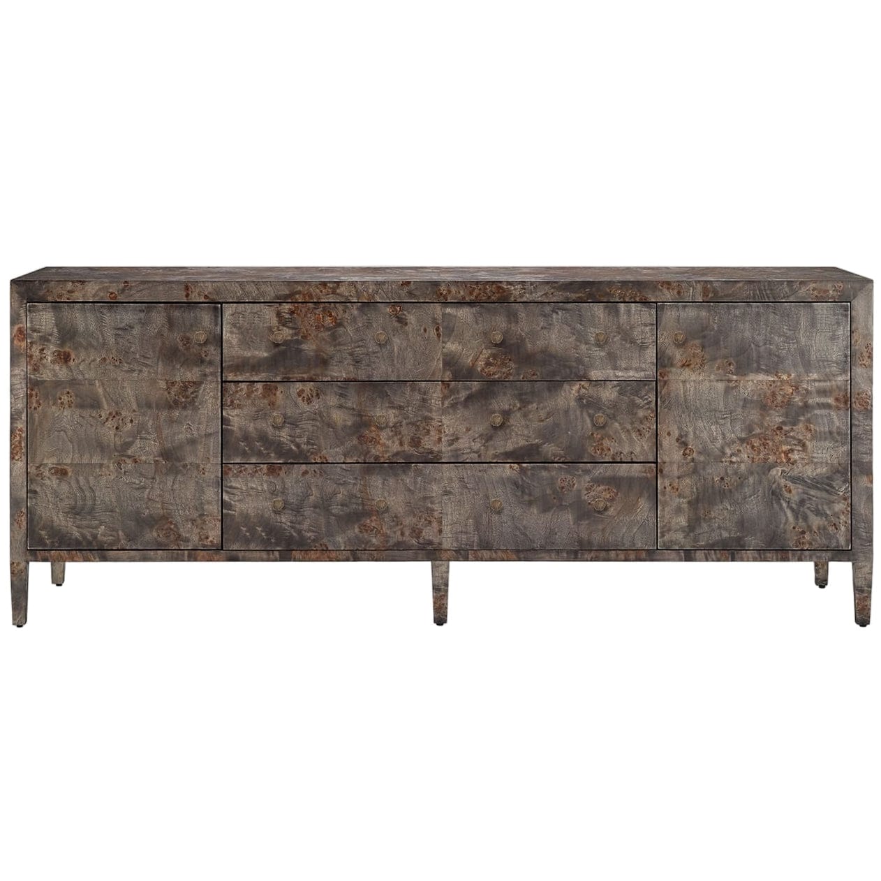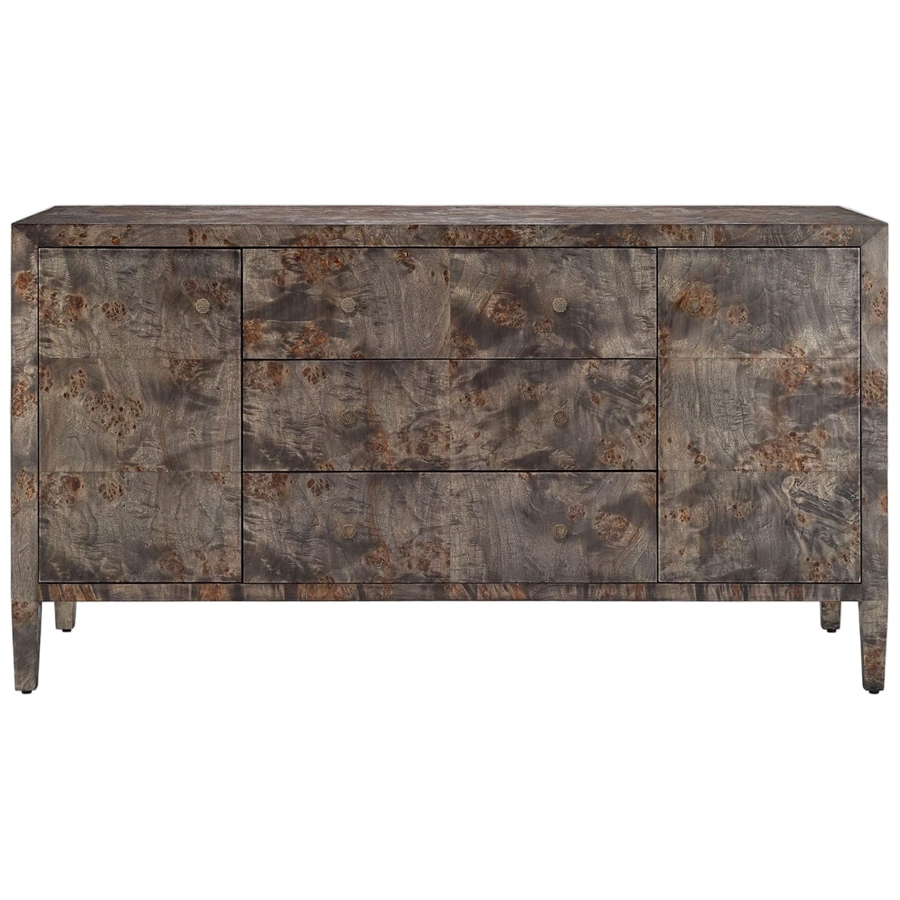 Made from naturally contrasting mappa burl and a sleek knob per drawer, this piece is as elegant as it is functional. Given the nature of the material, each pattern is one-of-a-kind.