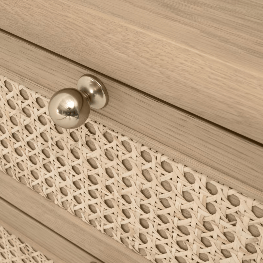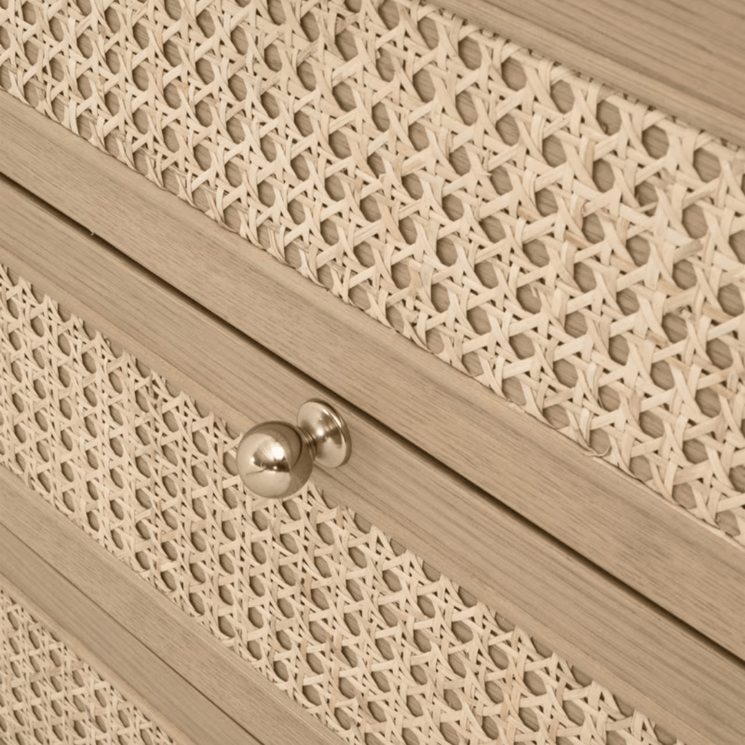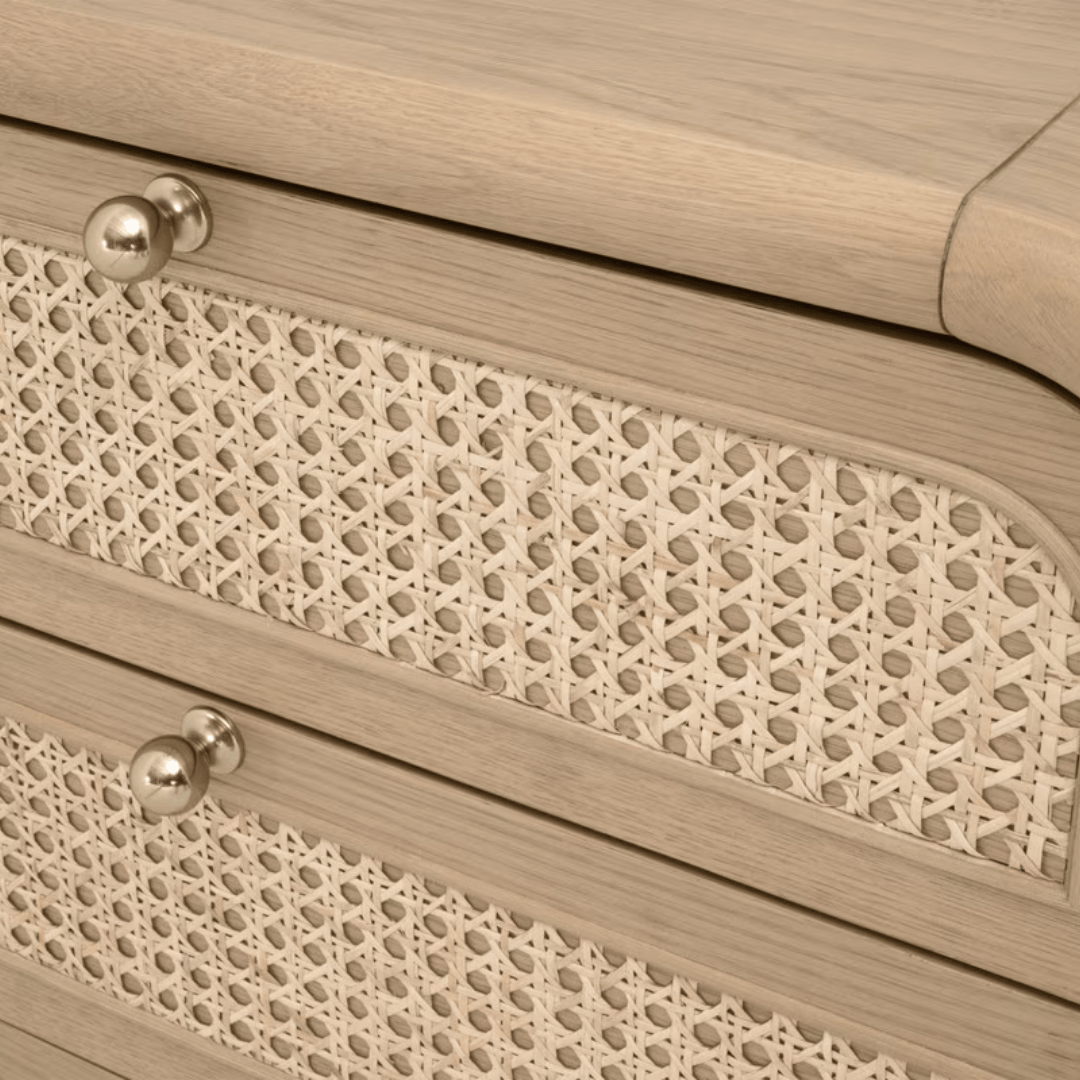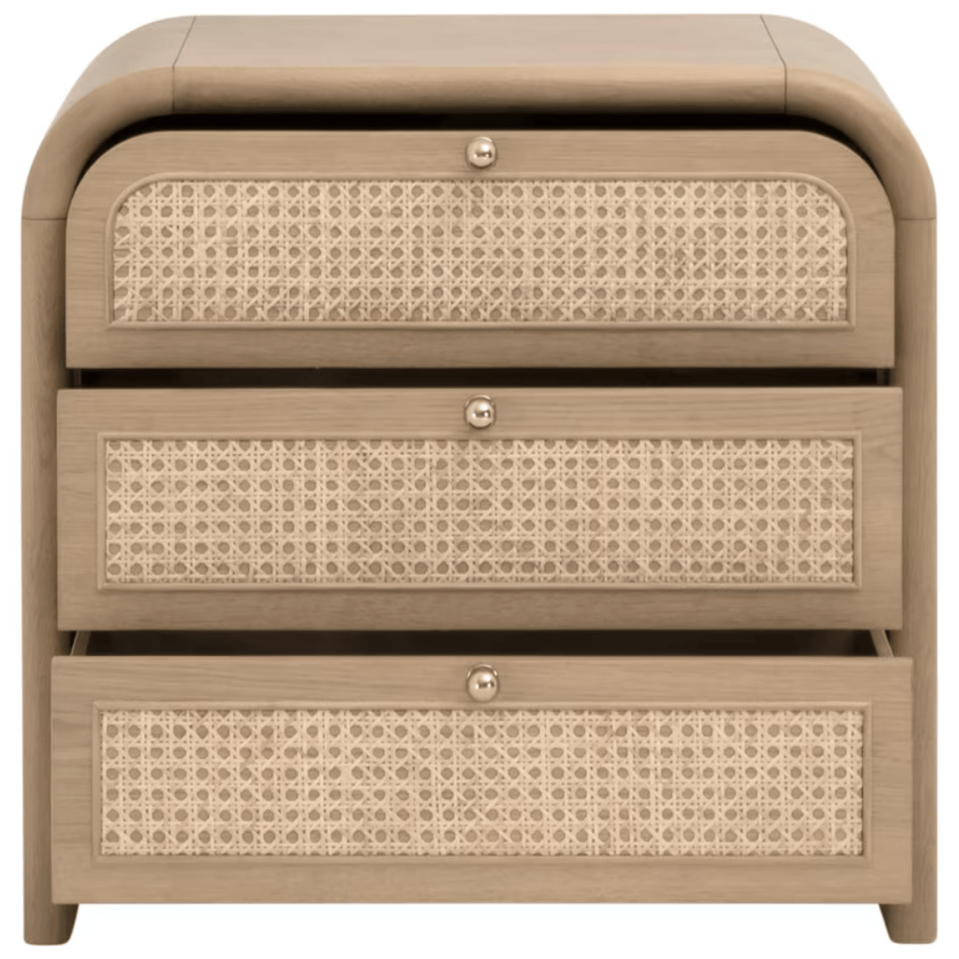 The Cannes 3-Drawer Nightstand by Essentials For Living embodies elements of mod chic and traditional designs with organic and earthy charm. Its solid natural oak wood and oak veneer frame radiates a warm, golden hue, accented by delicate cane inlay drawer fronts. Rounded edges add a soft and simple look to the frame. Measuring 28" wide, 18" deep, and 27" high, it features a felt-lined top drawer for delicate items and is equipped with dual 3/4 undermounted metal glides. The drawers are soft closing, ensuring smooth and quiet operation beside any bed.