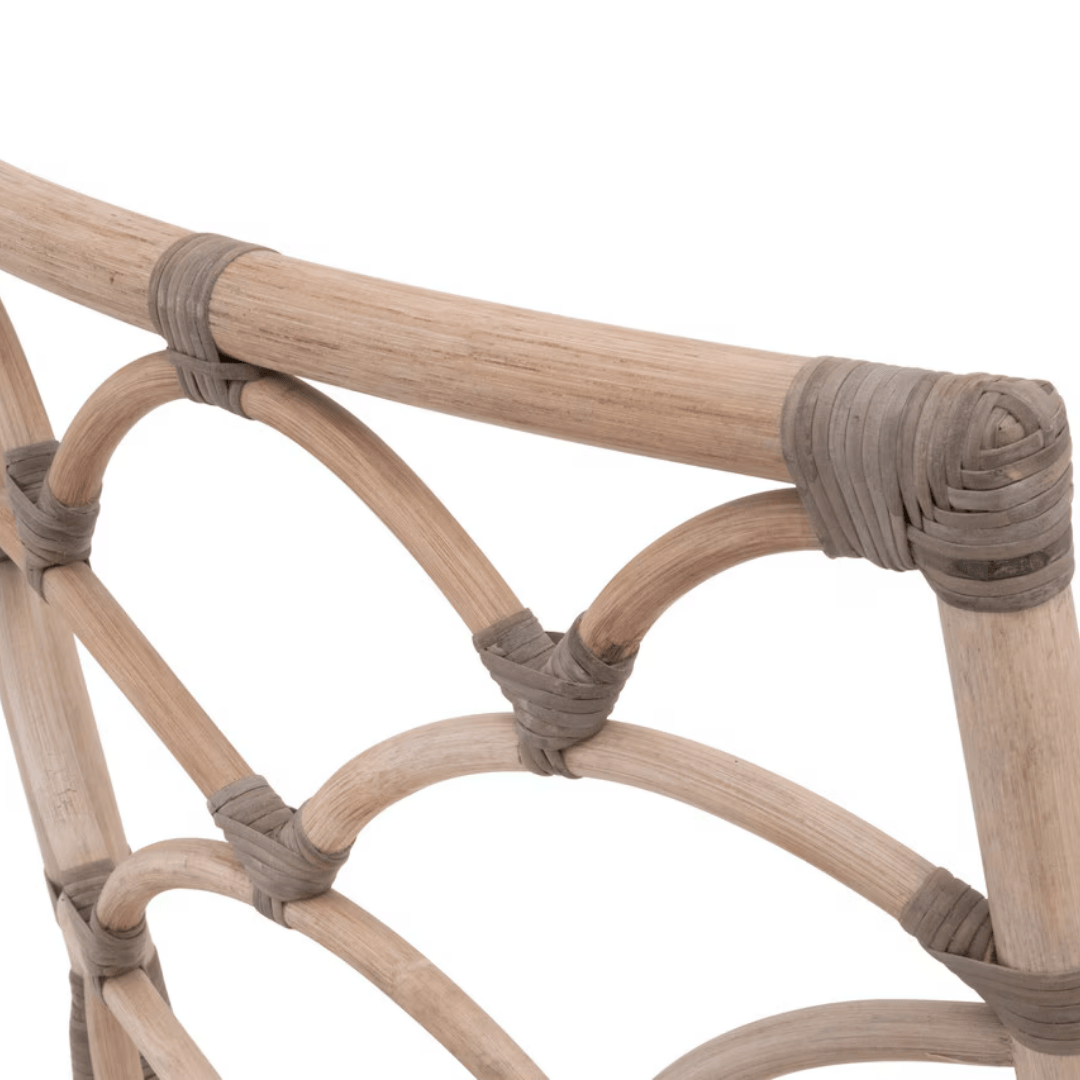 Designed with a tropical look, this unique Crescent Dining Chair by Essentials For Living will be ideal in a coastal, transitional, or bohemian dining room or kitchen. It is constructed with matte gray natural rattan materials that are hand-shaped into a beautiful design. The seat back has a crescent-shaped lattice design framed by a squared frame. Matte gray rattan binding adds a nice contrast to the rattan pole. The white upholstered seat complements the warm brown and gray hues of the frame. It measures 22.5" wide, 23.75" deep, 36.5" high, with a seat height of 20". The neutral tones of this chair will fit well with many dining room tables to create the perfect tropical-inspired aesthetic.
